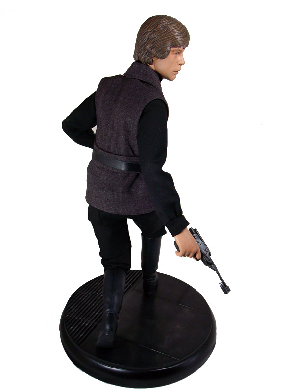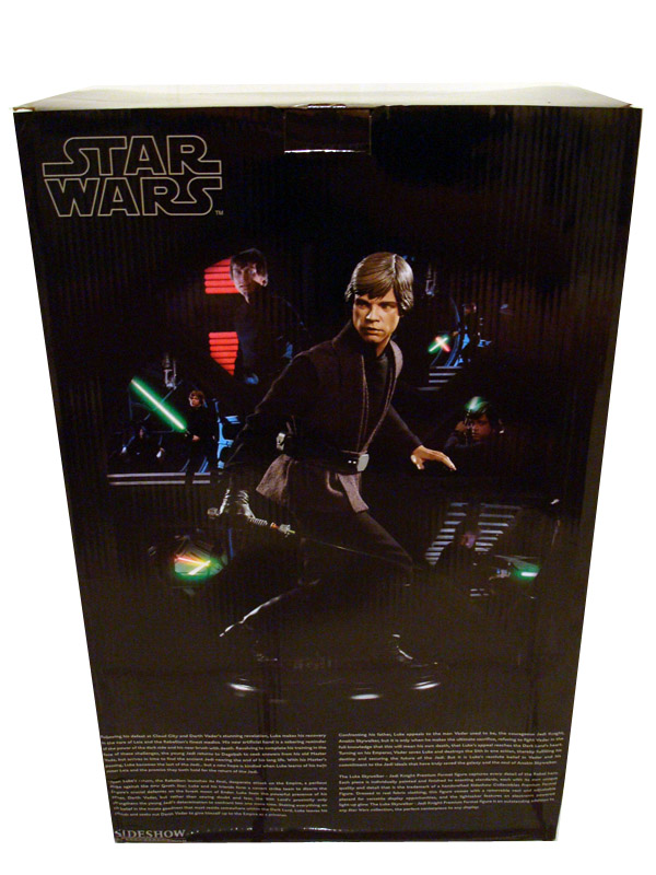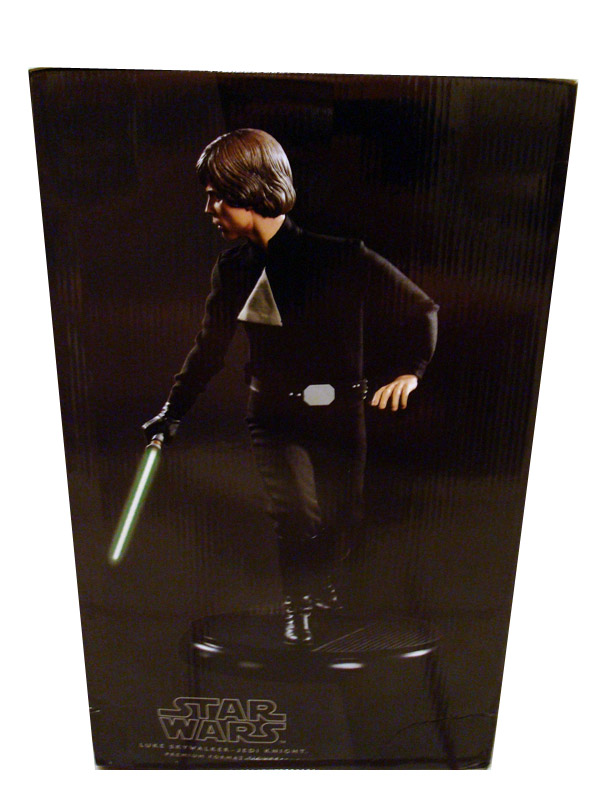 Luke’s packaging features the same color scheme and details of all the various Sideshow Star Wars lines. The overall box features an all around black color with the front corners edged with a sloping grey design. Each side of the box features a full-color photo of the statue, with the back showing images of Luke from the film, as well as a bio of the character. On the inside, Luke has been packaged and protected wonderfully, every part wrapped in foam wrapping and encased in a Styrofoam shell.