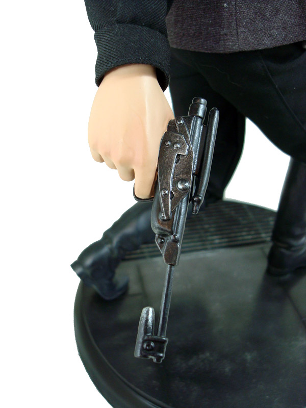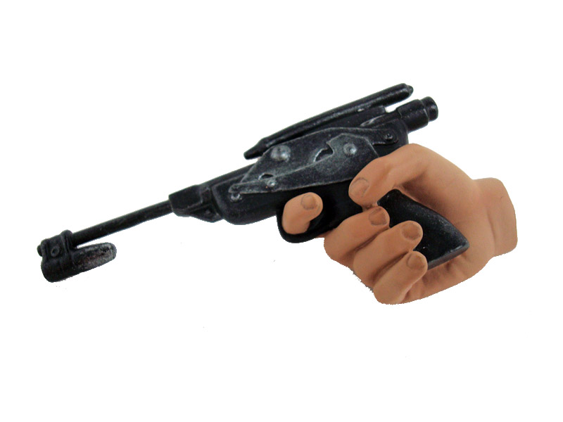 On top of his costume, the Sideshow Exclusive version of the figure offers even more versatility. His right hand is removable and interchangeable with two options. The regular version wields his ignited, green-bladed lightsaber in his black-gloved hand while the exclusive features his ungloved hand holding the blaster pistol that he pulled from the grip of one of Jabba the Hutt’s henchmen while he faced down the vile gangster. Sadly, the figure lacks his Jedi cloak that he wore into Jabba’s palace. One extra benefit the figure does have is the addition of a battery-powered light-up feature for his lightsaber that is activated through a button at the rear of his base.