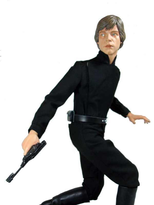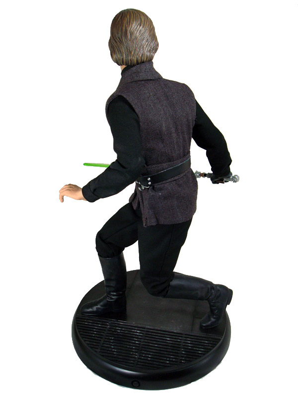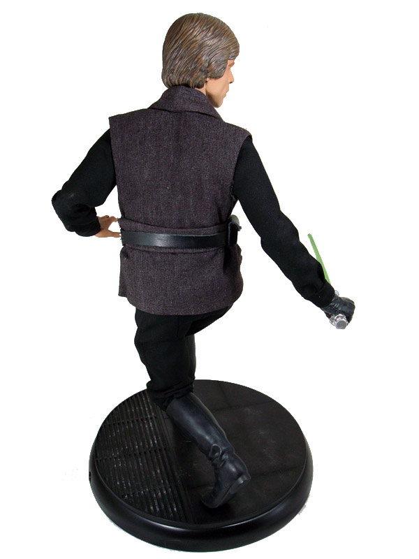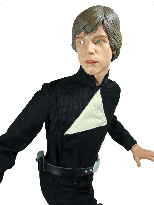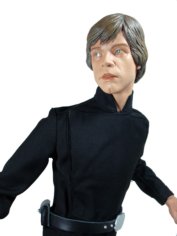 But even more impressive than his head sculpt is the character’s costume. Luke is dressed in his Jedi Knight outfit from Return of the Jedi, more specifically from the end of the film when he finally faces both his father, Darth Vader, and the evil Emperor. Posed in a at-the-ready crouch, Luke’s outfit consists of black pants, belt, a long sleeve black shirt, and his vest. While the costume isn’t that complex, it’s the versatility of display that really stands out. Fans can display the figure with out without his vest and can choose to have the placard (flap) on his shirt up or folded over, secured by a magnet. His detailed belt is removable and features small details such as his saber clip and pouch.