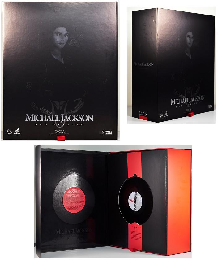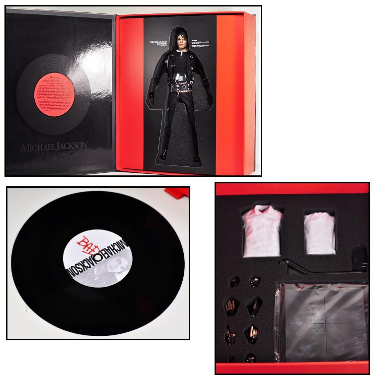Hot Toys is always very serious on the quality of their produxt; even the packaging is well designed. On the front part, a portrait of MJ is printed in black/grayish color, giving the package a classic feel. When you open it, the interior looks like a disc cover with a fake disc on it black and red everywhere. On the left cover flip, the legendary biography of MJ is printed, giving fans a brief introduction to this historic musician. And on the right below the fake disc, the list of songs awarded to album "Bad" is also printed.