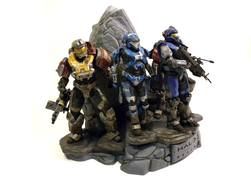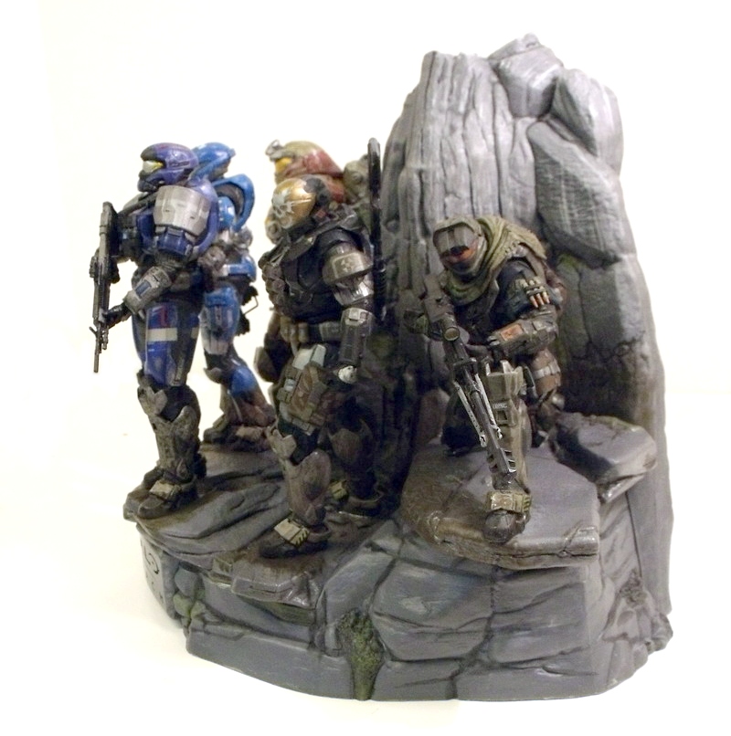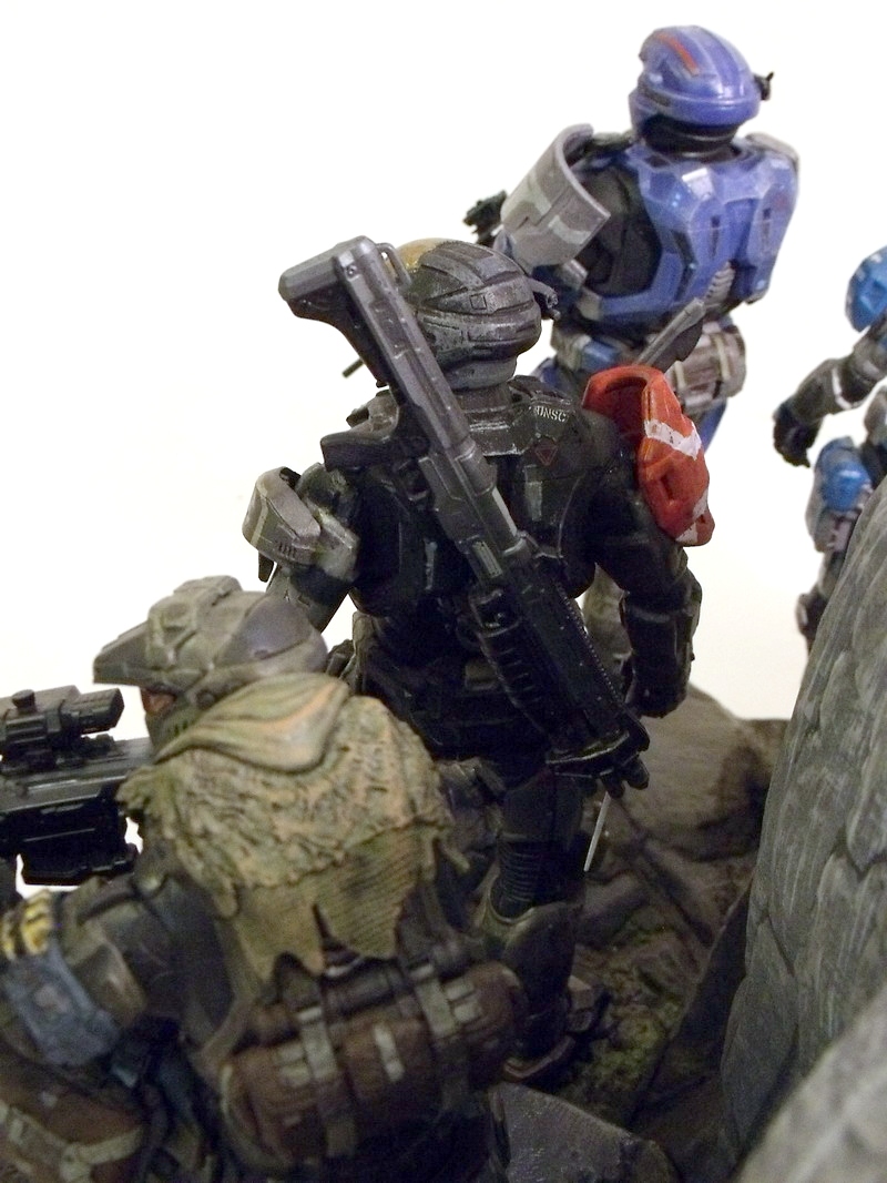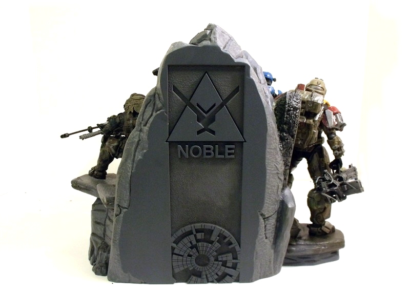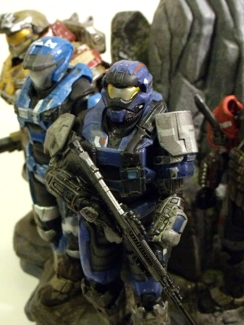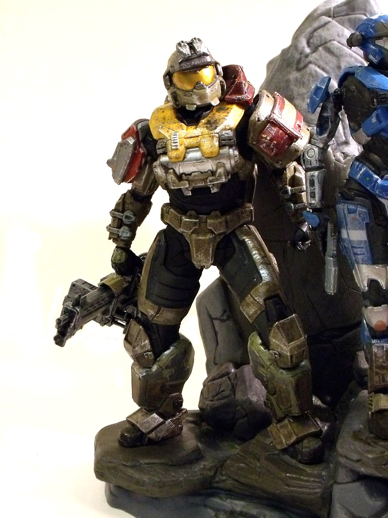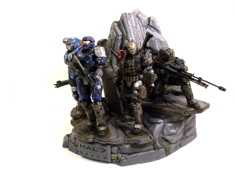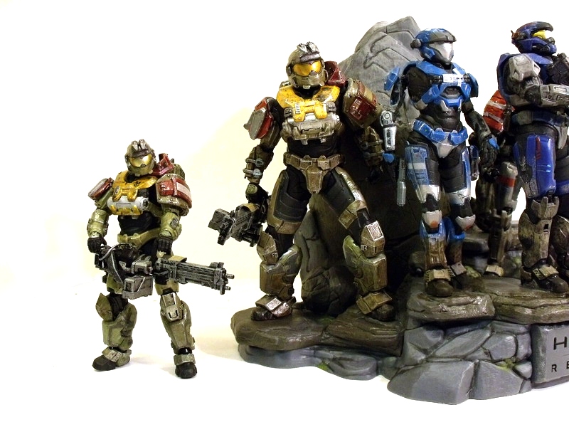 Collectors of McFarlane's Halo Reach action figures curious about the scale need only look at the picture above. On the left is the Jorge action figure, standing about an inch shorter than Jorge the statue. It's not a huge difference, but combined with the rest of Noble Team and the monumental rock base, it all adds up to a very meaty collectible.