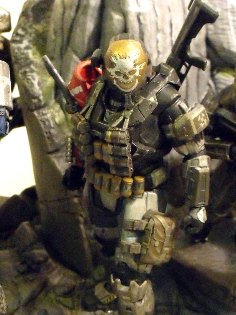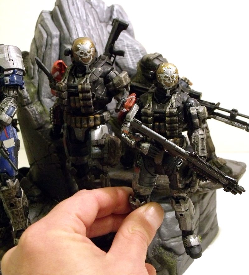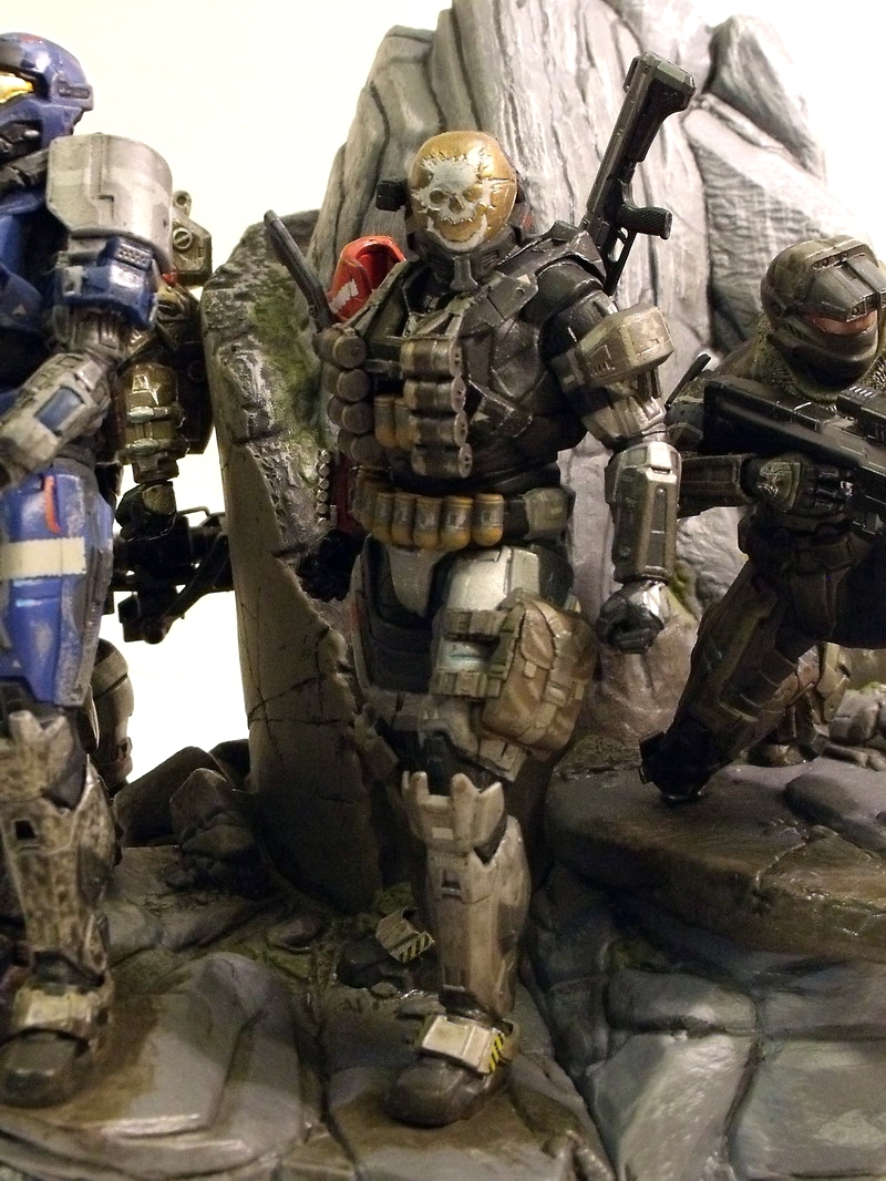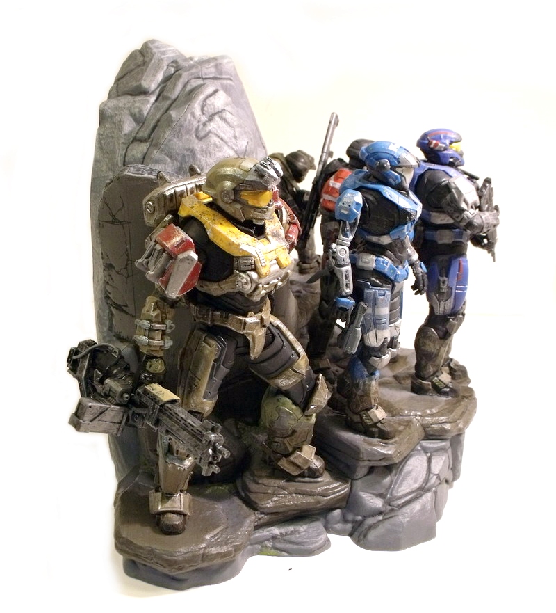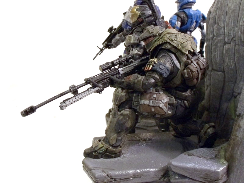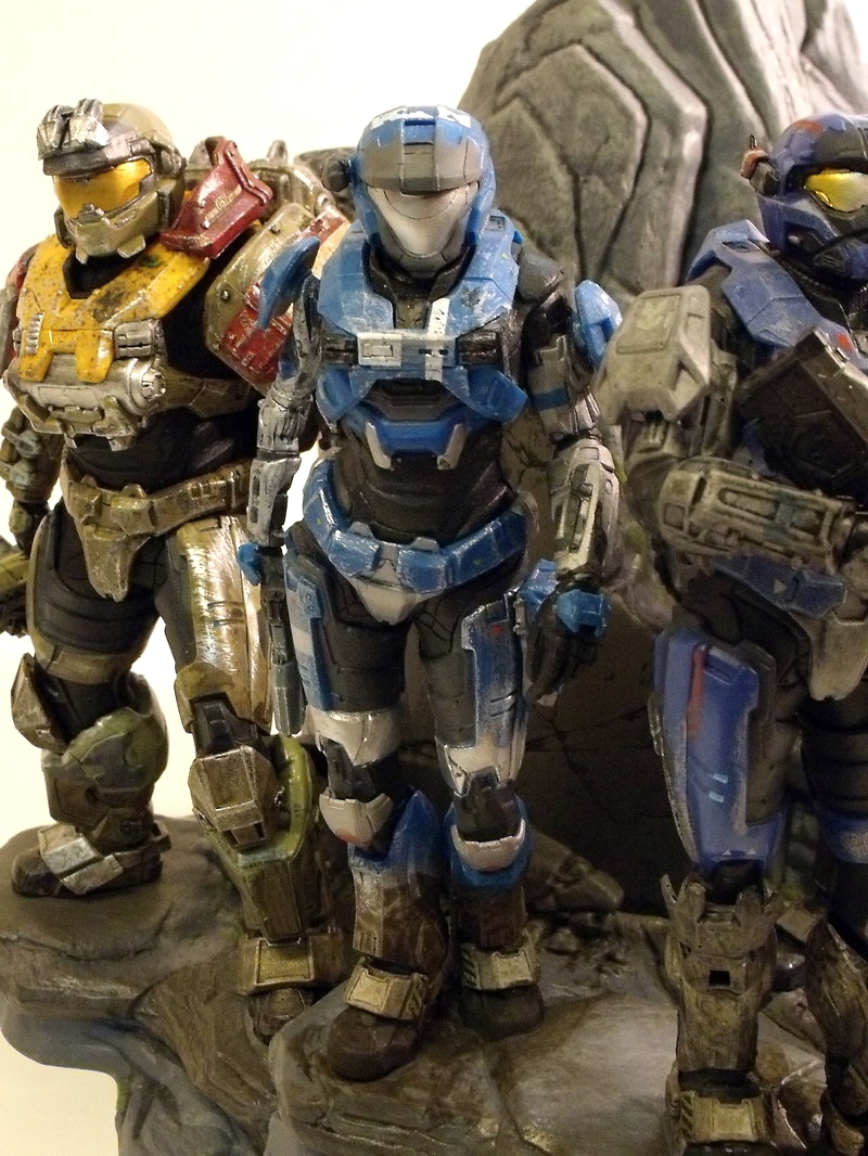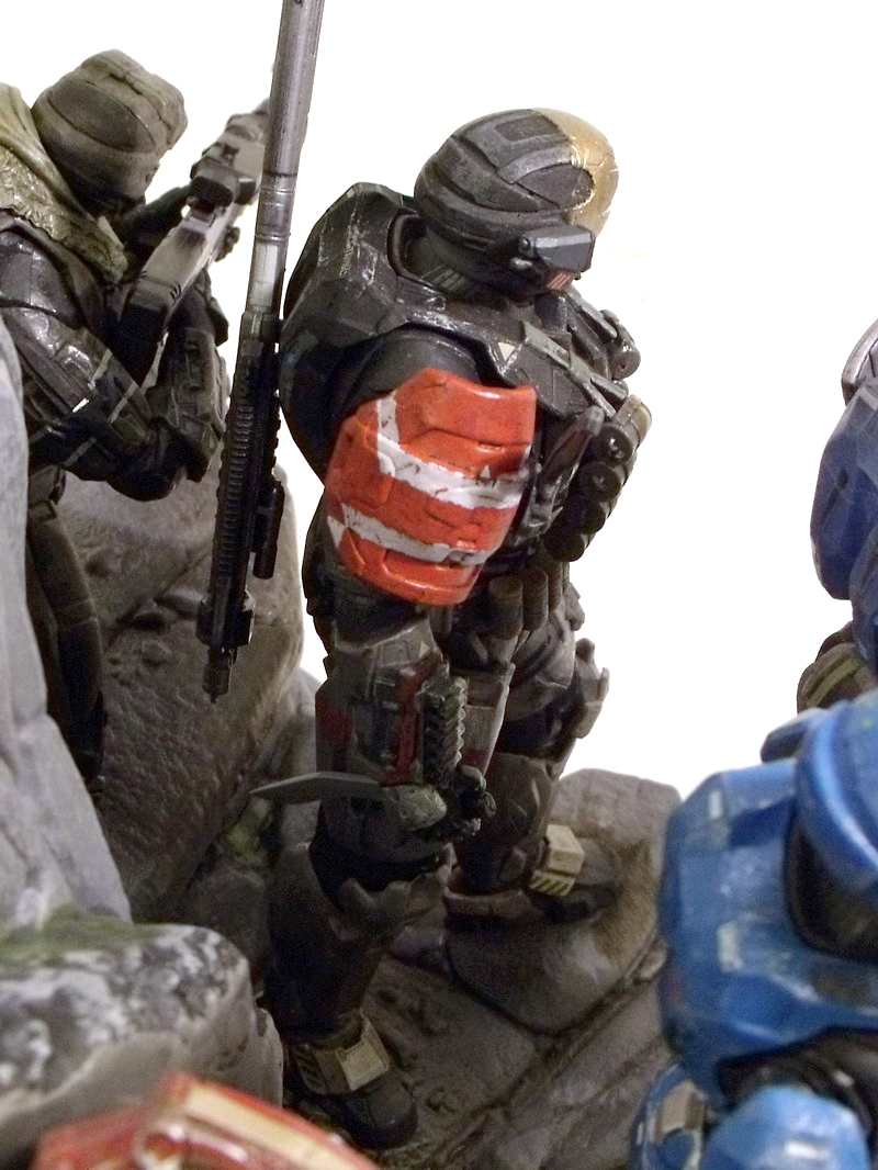 Collectors of McFarlane's Halo Reach action figures curious about the scale need only look at the picture above. On the left is the Jorge action figure, standing about an inch shorter than Jorge the statue. It's not a huge difference, but combined with the rest of Noble Team and the monumental rock base, it all adds up to a very meaty collectible.