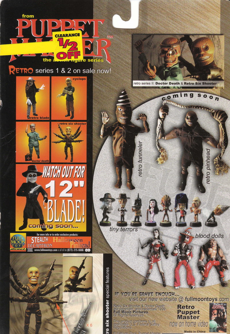 I've seen most of the Puppetmaster movies, but have never considered myself a hardcore fan. I appreciate them for what they are: fun B-movies. Puppetmaster does have a loyal fanbase, however, evident by the wave after wave of fiendish action figures created by Full Moon Toys. The company had a pretty good run with their Puppetmaster action figures, capturing all the dolls from the original movie (including a gazillion variants), as well as their "retro" look from the prequel film, Retro Puppetmaster. I really like the look of these raw, hand-carved "wood" dolls over the more modern classics. Unfortunately, I caught these as the series was ending, only managing to snag Six-Shooter on a 1/2 off clearance sale. I may track down a few more... just for the fun of it...