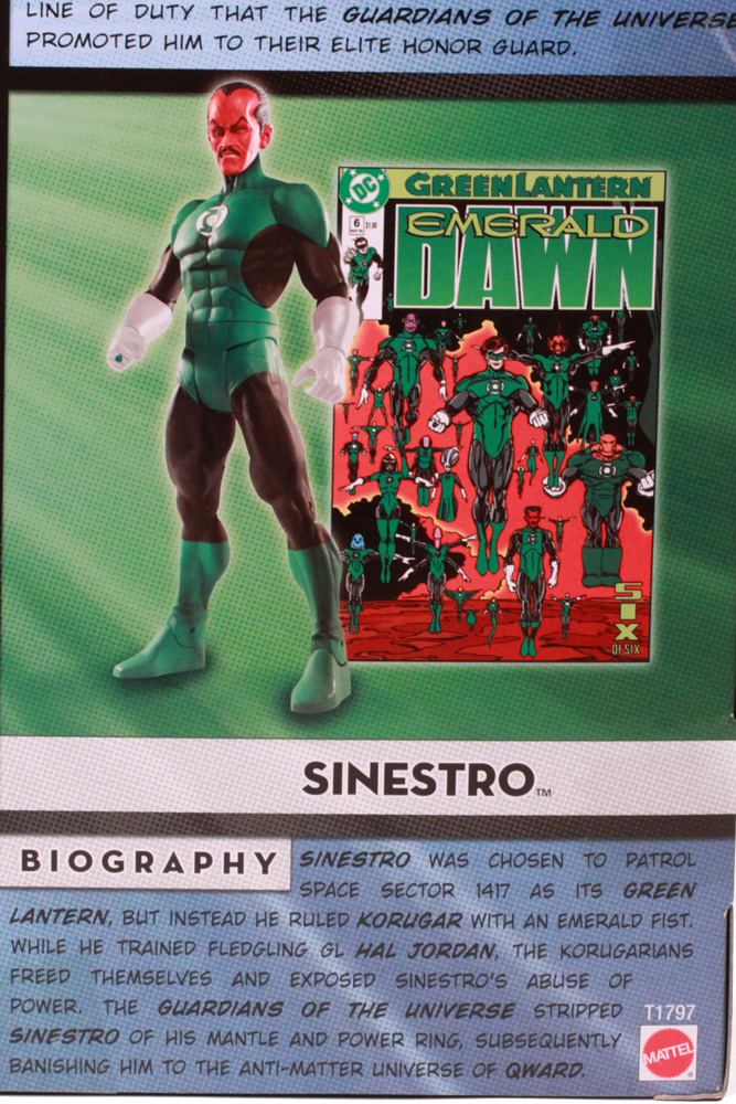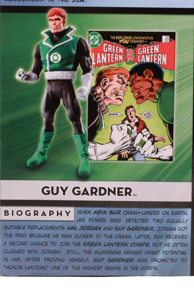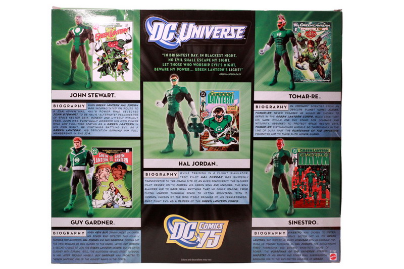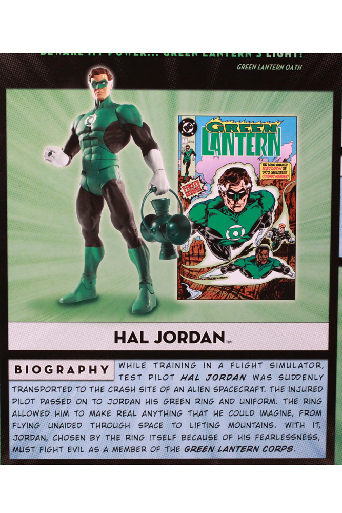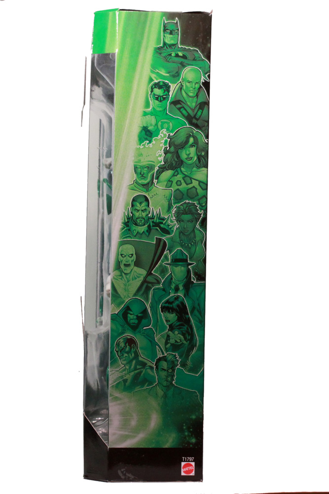 The sides of the box have the typical lineup of characters who have been made into DCUC figures, all in a green cast. The back of the box is a big improvement over similar products. Instead of a lot of background imagery or boring graphics, the panel is divided into five sections. Each Lantern has a photo of his figure, a relevant comic book cover, and a fairly in-depth biography. Frankly, it's a great package design and hopefully we'll see more like it from Mattel.