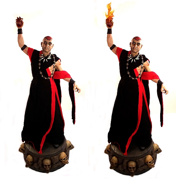 The interchangable appendages are all cast of solid resin and attach firmly via powerful magents. I LOVE magnets in statues, as they make swapping out parts a breeze. The translucent resin used on the flaming heart is an eye-catcher, but the real showstoppers are the face sculpts. Both heads are extremely life-like and nail actor Amrish Puri's distinctive features perfectly. The real kicker are the eyes: the windows to the soul. They have a realistic glisten to them and man, that stare... The eyes absolutely define this piece.