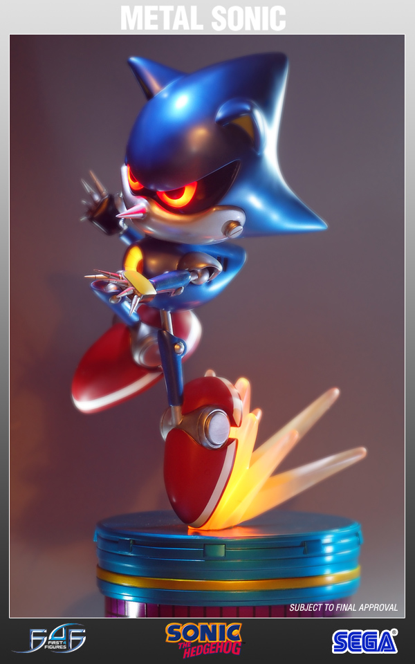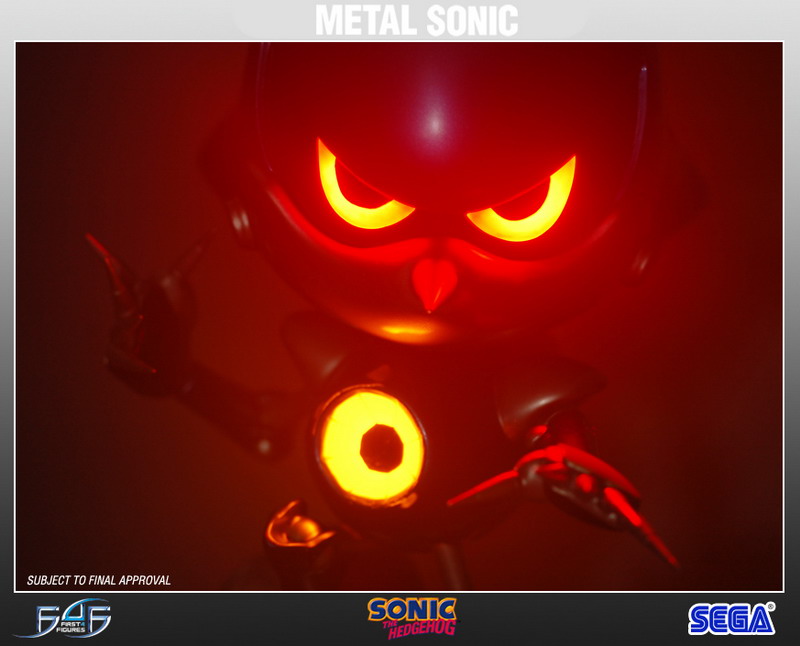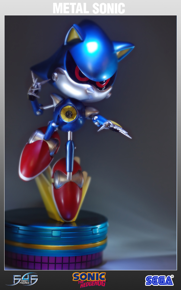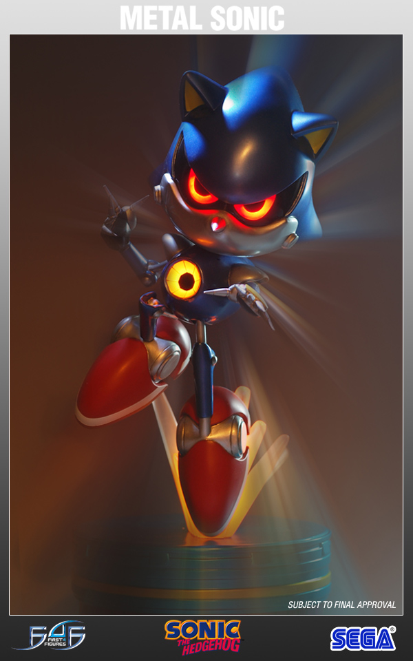Scheduled for release second quarter 2011, the Metal Sonic statue is being offered as two 14.5 inch tall versions: a regular release (pictured above) that is limited to 1,500 pieces and priced at $154.99 and a first4figures.com exclusive version limited to only 350 pieces and priced at $174.99. The latter features light up eyes, chest and back engine. Additionally, the base comes with lights that light up the transparent spark by alternating between flashing and continuous lights. The lights slowly fade away after you turn them off.