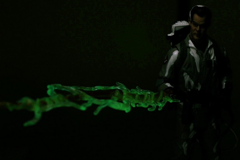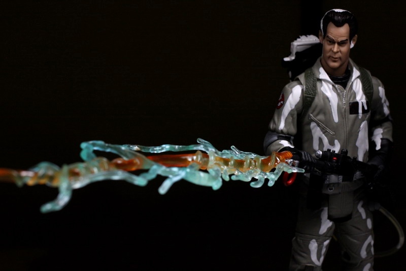Another essential accessory: the stream. The first time we got it was with Peter Venkman. This time it glows in the dark. Ray also comes with the familiar Ghostbusters stand that also received the marshmallow treatment.