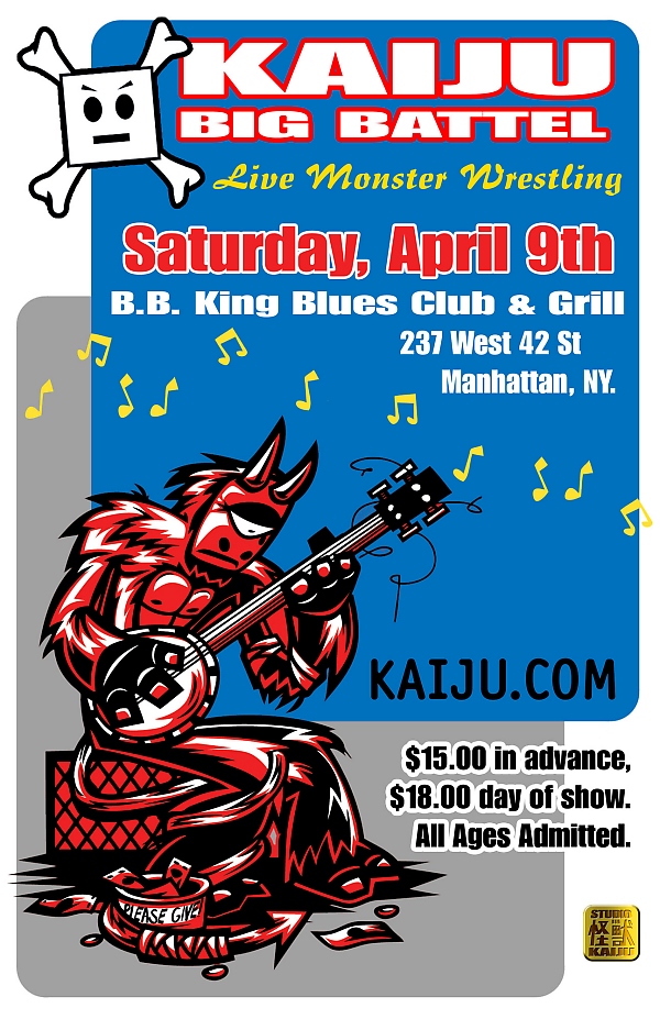 Kaiju Big Battel will invade B B Kings on Saturday, April 9th. This night of live monster fighting will showcase Kaiju favorites, Steam Powered Tentacle Boulder, Hell Monkey, Dusto Bunny, and possibly even Dr. Cube (if the rumors are true that he is truly alive) plus 45 blocks of crushable cityscape primed for destruction.