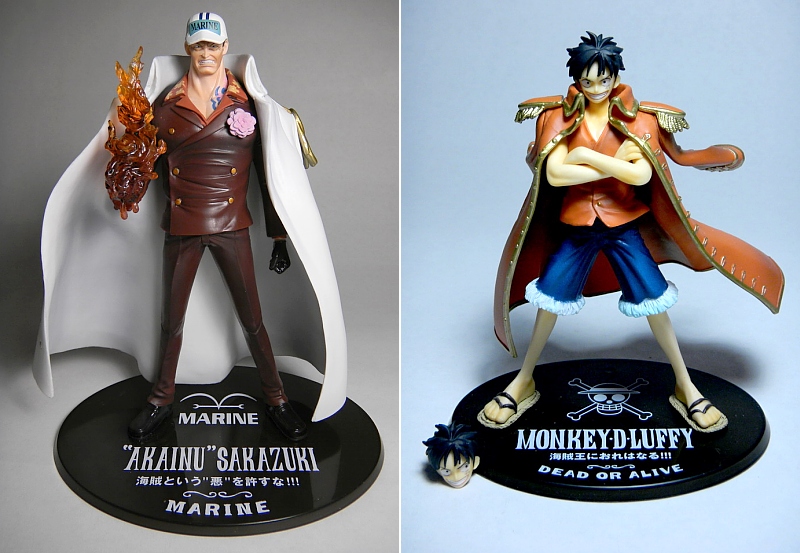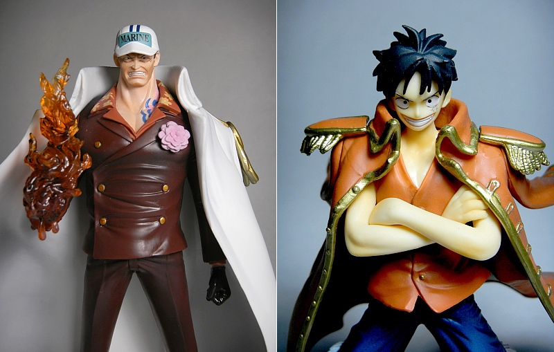 PAINT: As far as painted details go, al of these figures are decorated with a very high level of precision and detail. The most impact color techniques are visible in Marshall D Teach and Akainu which feature dry-brushing details and multiple color shading which enhances their three-dimensional form. Akainu’s magma-covered hand is colorized beautifully with a vivid blend of translucent reds and yellows which give the impression of realistic flames. The colors on Monkey D Luffy and Shanks are also applied with precision and accentuate each anime character’s three-dimensional representation.