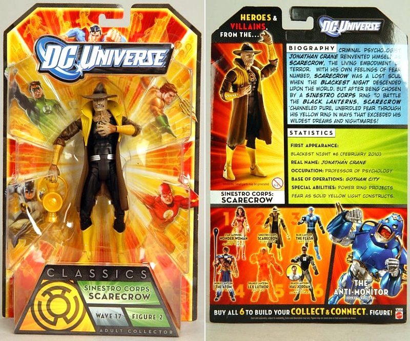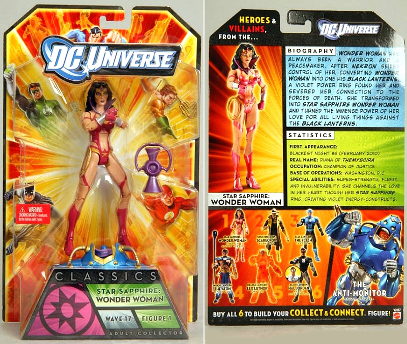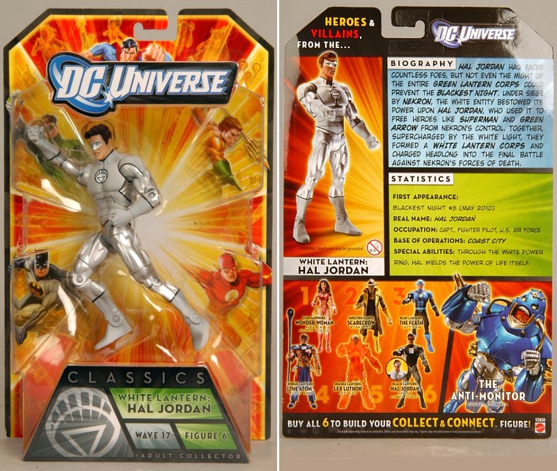 Mattel provides a packaged look at their latest assortment of DC Universe Classics: Wave 17. Themed after the Blackest Night story line, this Lantern filled series includes Indigo Lantern Atom, White and Black Lantern Hal Jordan, Blue Lantern Flash, Orange Lantern Lex Luthor, Sinestro Corps Scarecrow, and Star Sapphire Wonder Woman. Get them all to build your very own Collect-and-Connect Anti-Monitor. Look for DCUC 17 this summer.