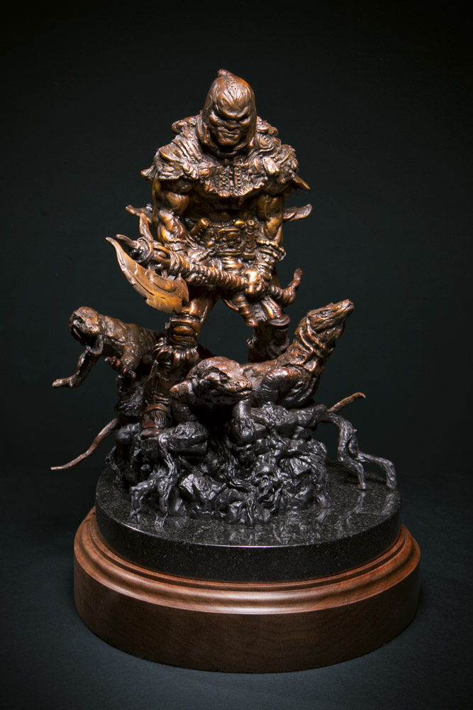 The Shiflett Brothers have taken their popular Komodo King resin kit to the next level with a new ultra-limited run of the hooded warrior cast in bronze. Presenting the Komodo King Bronze Edition, an amazing homage to legendary fantasy artist, Frank Frazetta. Measuring in at 12.5 inches tall including dark granite over a walnut base, the Komodo King Bronze Edition comes expertly cast by Deep in the Heart Art Foundry, leading metalsmiths best known for their beautiful bronze work for Clayburn Moore and Ray Harryhausen, to name a few.