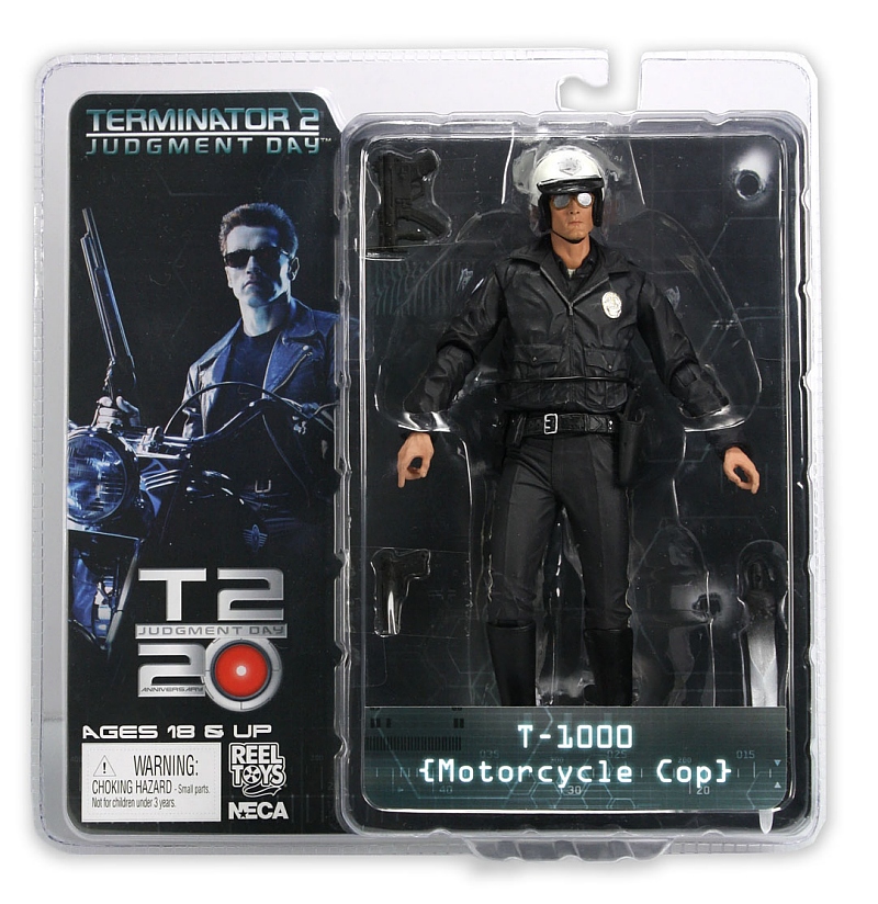 Part of NECA's new 7-inch Terminator Collection, comes the T-1000 Motorcycle Cop. Pictured above is the production T-1000 action figure, packaged and ready to ship with Series 1 later this month - just in time to celebrate T2's 20th Anniversary.