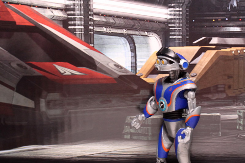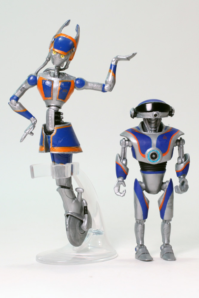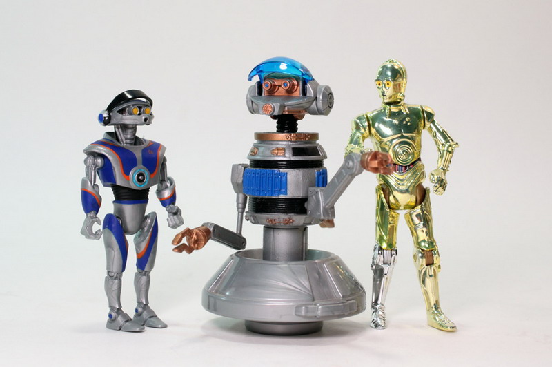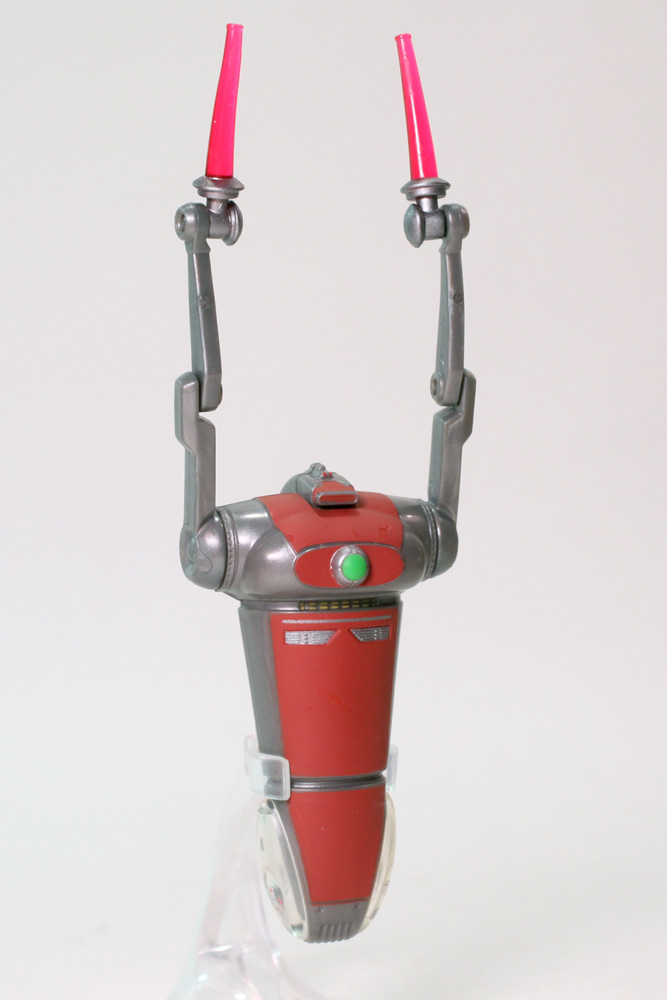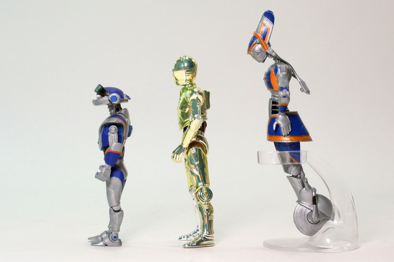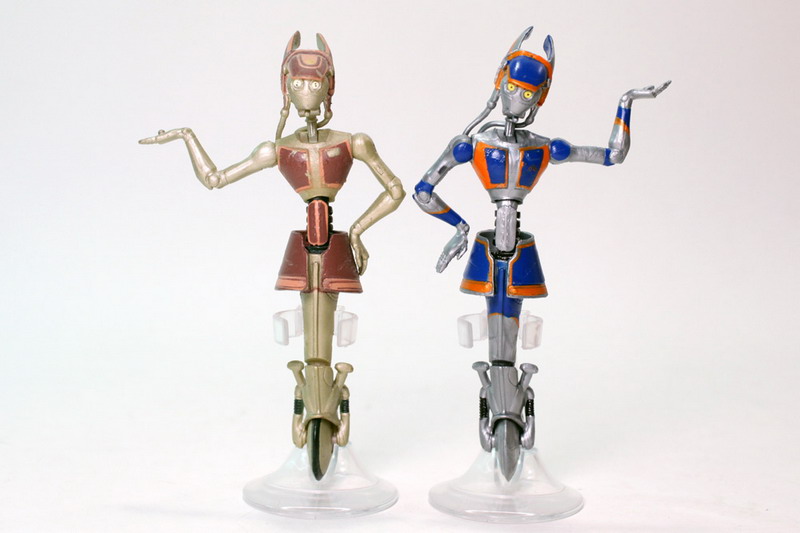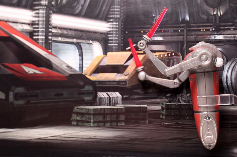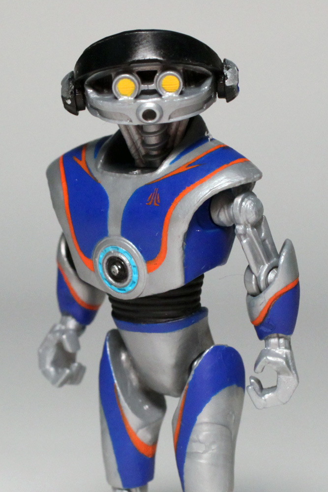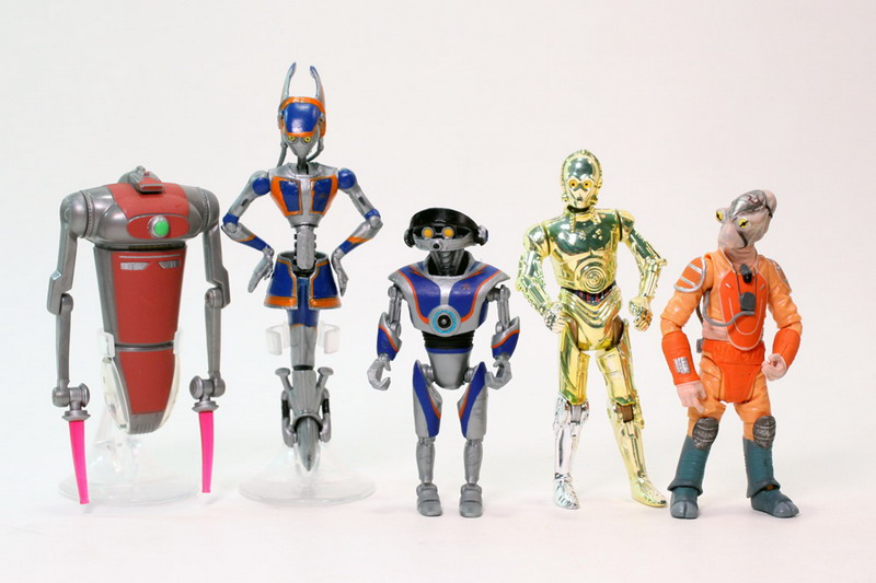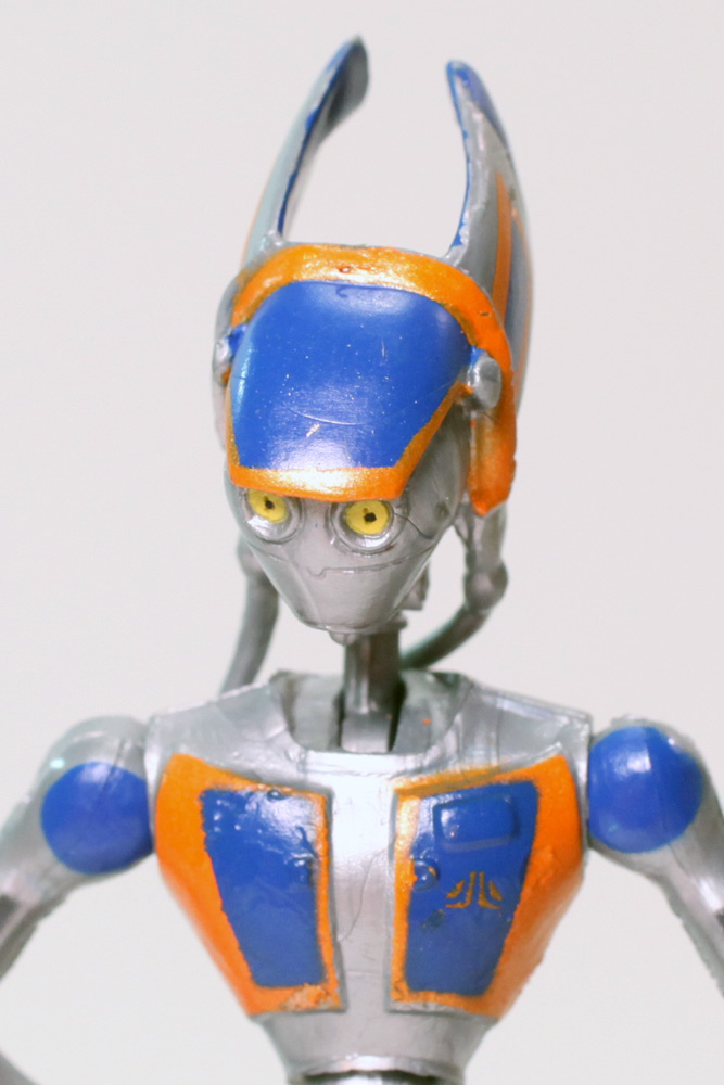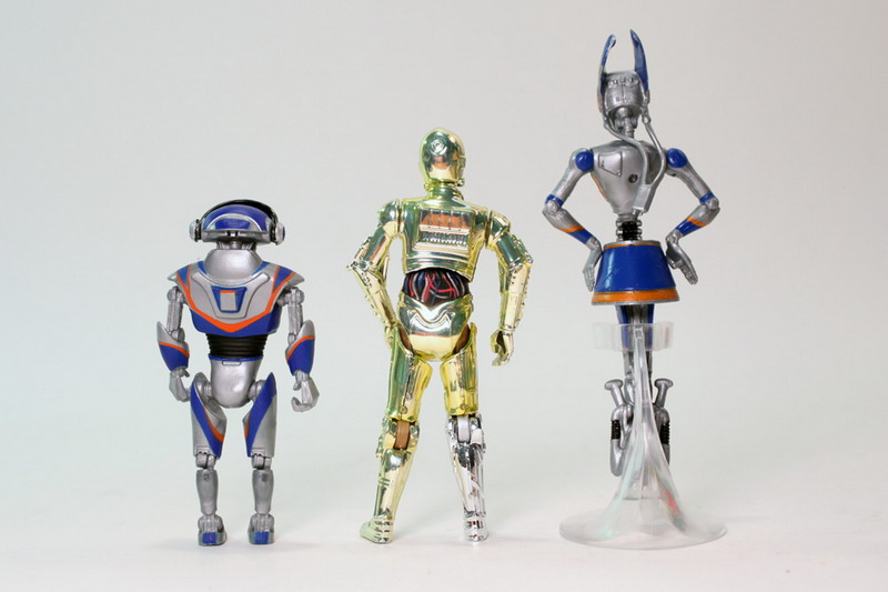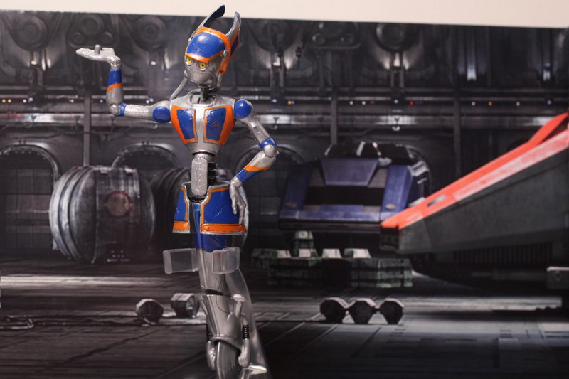 Voiced by Allison Janney in the queue, Aly San San is the official spokes bot of Star Tours. She is a WA-7 service droid (also seen in Attack of the Clones) repainted in the Star Tours color palette. Since Hasbro has released the WA-7 droid before, Aly San San (not pronounced ***) is a straight up repaint of that figure. The clear stand included that can prop up the Signal Droid also has the proper slots to give Aly San San a proper stance, much better than the original stand anyway. The main problem is that her wheel never touches the ground. She has eight points of articulation: upper neck, lower neck, ball shoulders, waist, and rotating wheel.