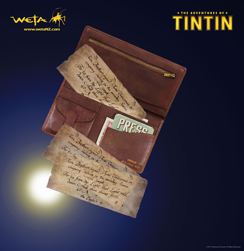 Those that pre-order the book directly through Weta at wetanz.com ($39.99) will receive, while supplies last, three "parchment scrolls" (printed on semi-transparent paper - pictured below) that together form the map to Red Rackham's Treasure. These come inserted in a folder made of 300 gsm paper printed in the likeness of Tintin's wallet.