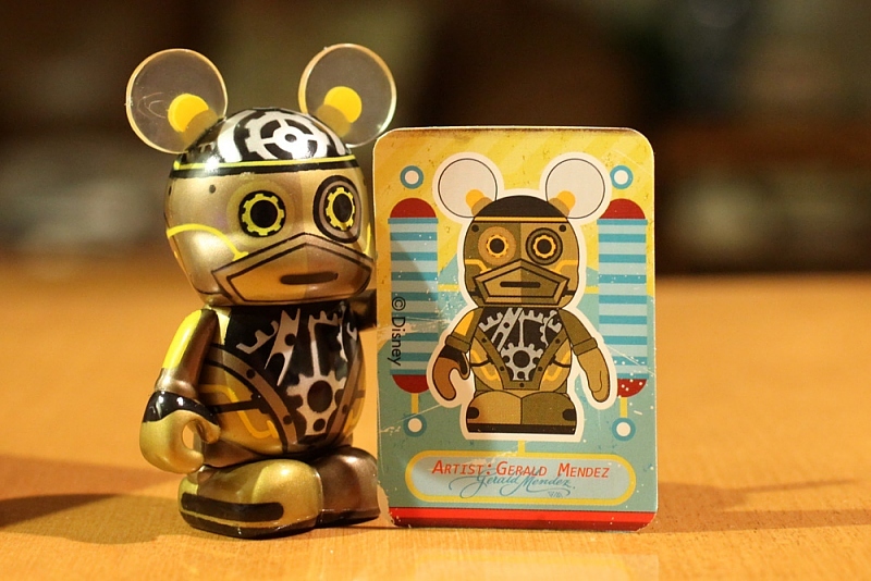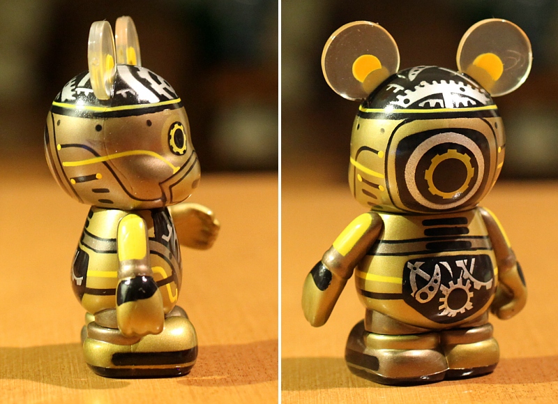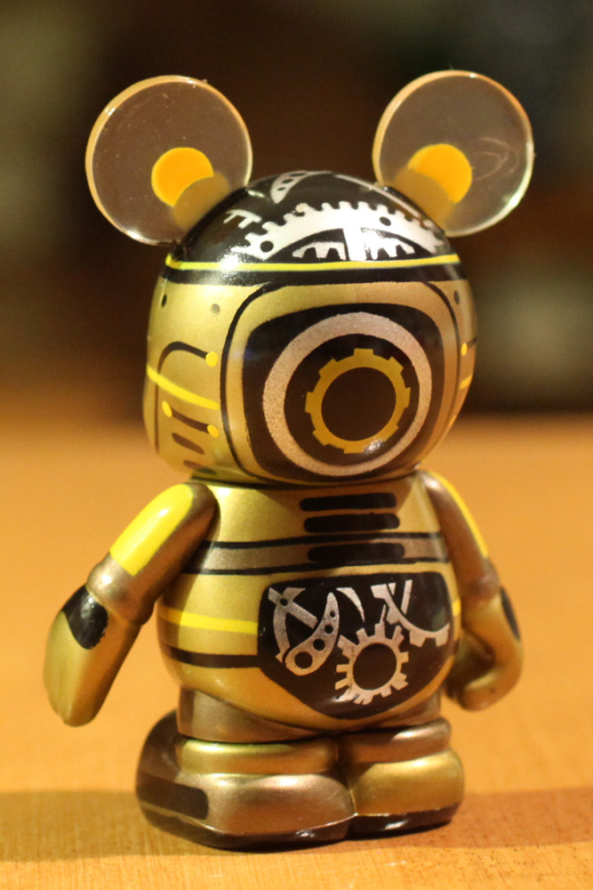 Every Vinylmation Robot features the exact same sculpt of Mickey Mouse, it’s the paint and design that will differ. The Robot pictured here is the Steampunk-Bot deisgned by Gerald Mendez. Other Vinylmation Robots are designed by Disney Store artists Jim Valeri, Marcella Lau, Enrique Pita, and Oskar Mendez.