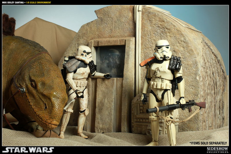 Sideshow reveals their latest Star Wars 12-inch action figure environment: Mos Eisley – Chalmun's Cantina. This piece will be available for pre-order through the Sideshow Newsletter on Thursday, August 18th, 2011, which is typically published between 2PM and 3PM (Pacific Time).