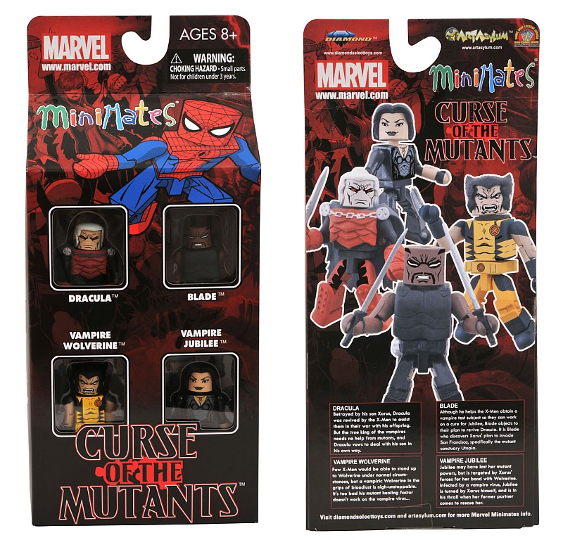 DST provides a packaged look at their latest Marvel Minimates box set based on the "Curse of the X-Men" crossover. This set stars vamped-out versions of X-Men characters Wolverine and Jubilee, as well as Blade and the big kahuna: Dracula. Look for the set in specialty stores near you in October.
