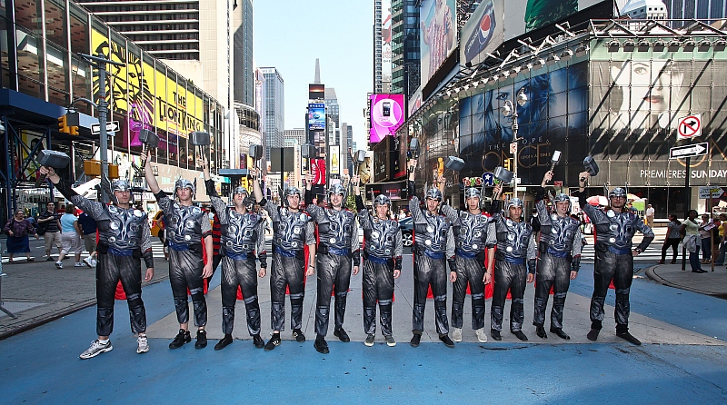 The mighty God of Thunder hit the streets of Manhattan yesterday, September 13th, in celebration of the Blu-ray and DVD debut of the film THOR. A dozen Thor look-alikes gave fans a chance to get a close-up look at the out-of-this-world warrior as he goes about daily life on Earth.