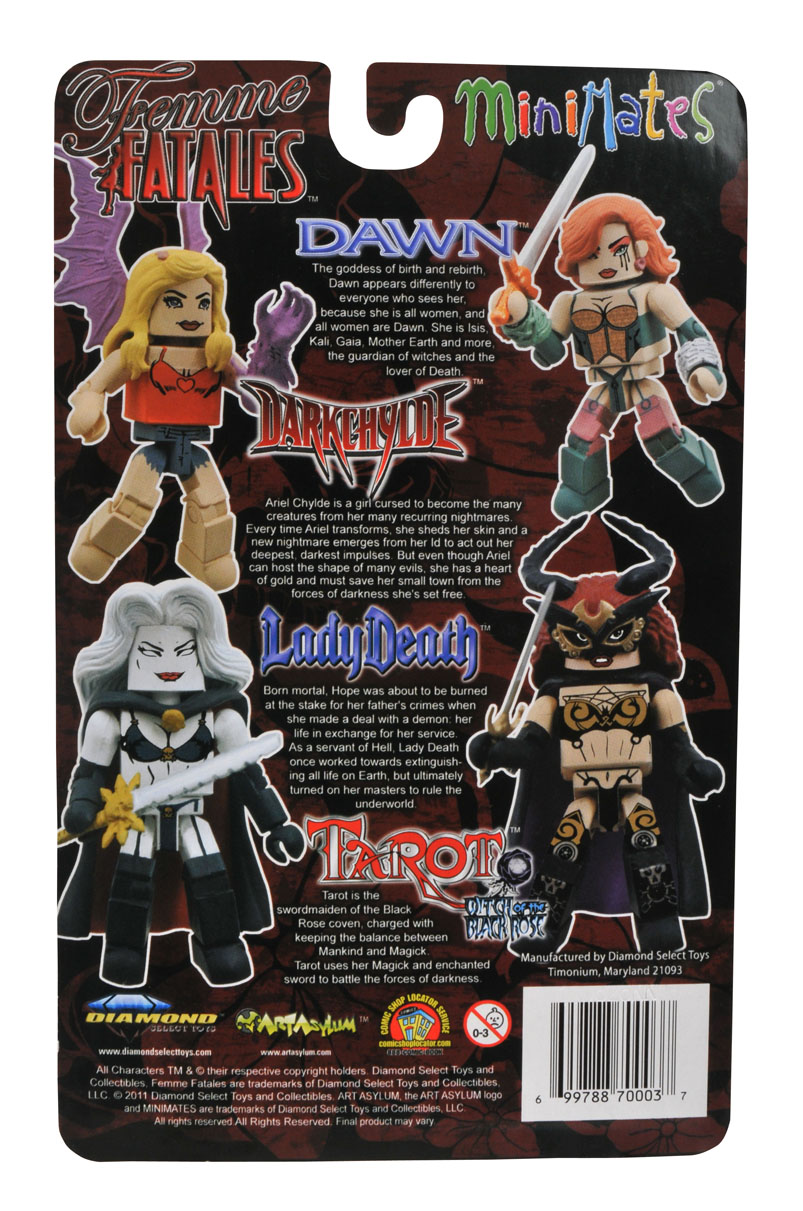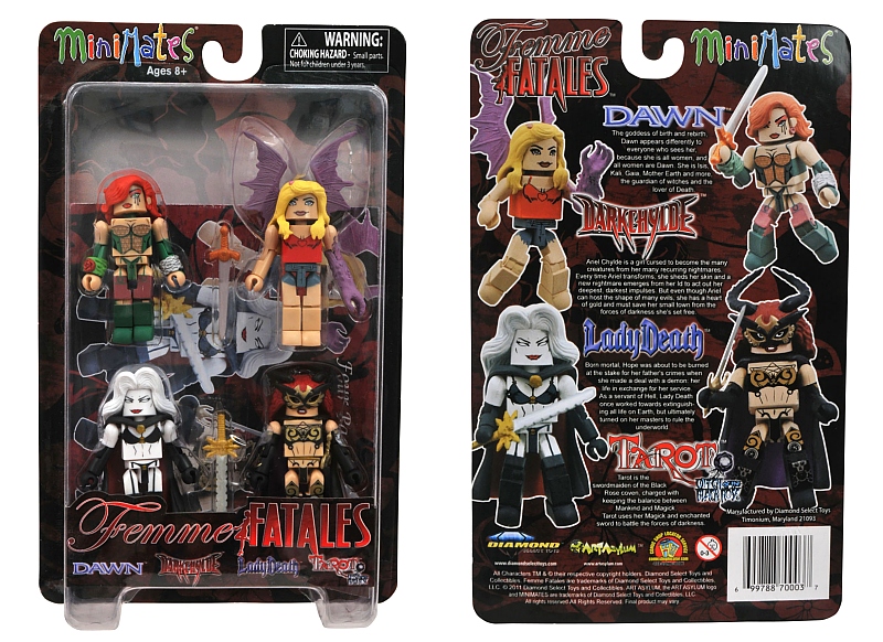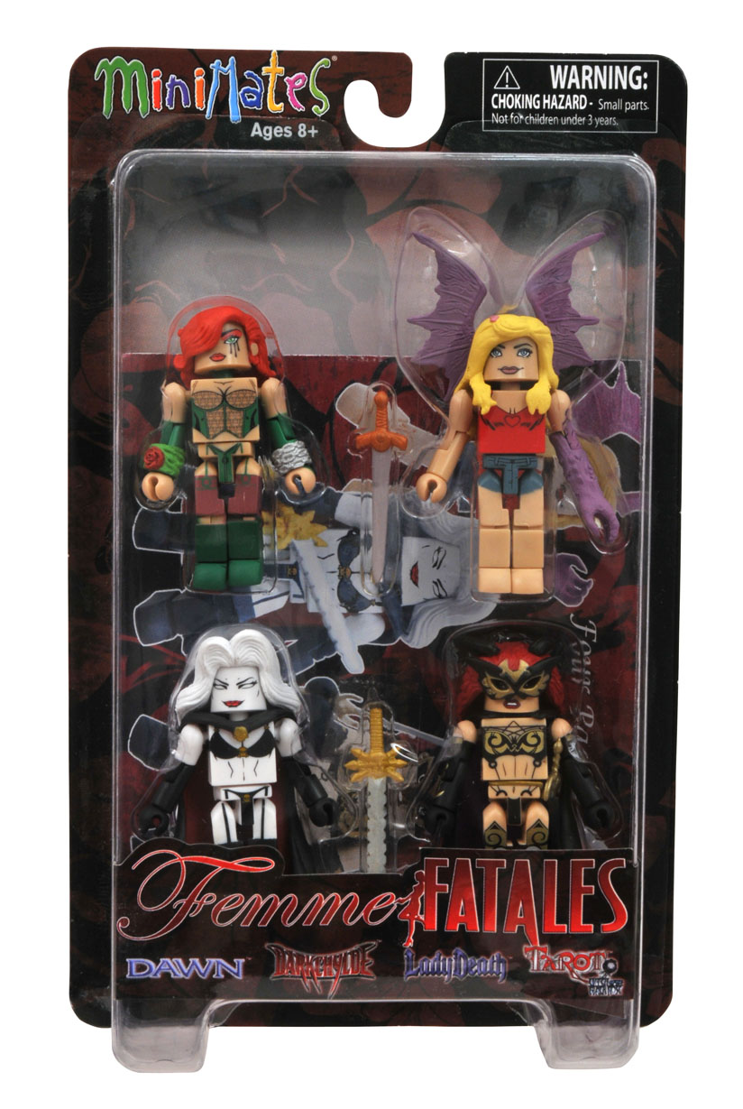 DST's new Femme Fatales Minimates pack all of the attitude of their 9-inch statue counterparts into a compact 2-inch package. Series 1, scheduled for release in Ocotber, stars Lady Death, Darkchylde, Dawn and Tarot. Pictured is a look at the little beauties packaged. Fans can look forward to a second assortment this November.