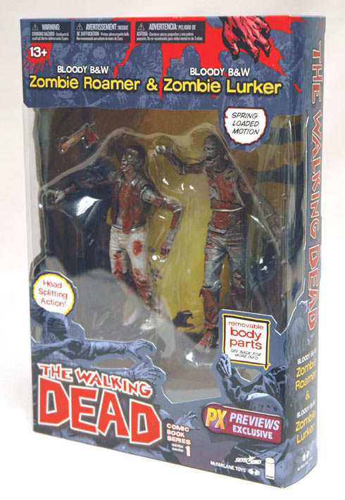 Packaged photos for McFarlane's upcoming Walking Dead Zombie 2-pack have been revealed. Exclusive to Diamond's PREVIEWS catalog, this set features Roamer and Zombie Lurker action figures both with a unique bloody black and white color scheme.
