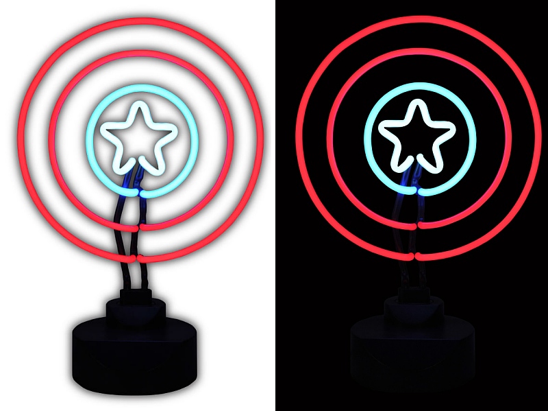 Diamond Select Toys makes great toys and statues, but who knew they were into neon? Following their Ghostbusters neon sign (available now), DST has recently started offering neon signs based on the Marvel Universe. The official Marvel Comics logo (above) is the first out this fall, and measures 9" by 12", with an adjustable base for either tabletop display or wall mounting. It will be followed by Captain America's shield sign (below - 11.5" in diameter) in early 2012. Both are available for pre-order now through select fine retailers, such as BigBadToyStore.com and Urban-Collector.com.