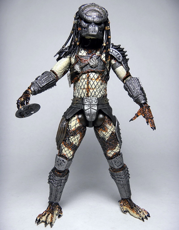 The color applications on these Predators are very detailed and vibrant. Each accesory, weapon and armored piece on the Predators is colored accurately with no visible bleeding or blotching. The City Hunter stands out significantly from the trio with his vibrant skin earthtones that contrast significantly against his weathered copper-colored armor. The Boar‘s skin is also colored in bolder hues with silver armored parts making him stand out among the other figures in the assortment. The Shaman has a light cream color to his body with black spotting, which does not match up to the cool gray colors on the prototype images featured on the packaging. Im not exactly sure if the final colors on the Shaman are the accurate ones or whether this was simply a miscommunication at the factory but I prefer the light gray deco and overall look. The body netting and accessories are colored very nicely and significantly enhance the overall look of each figure in this assortment.
