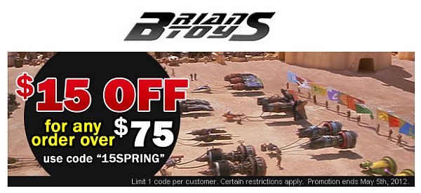 Brian's Toys is offering customers a $15 OFF coupon for all orders over $75. Good for all in-stock orders placed by May 5th, 2012.