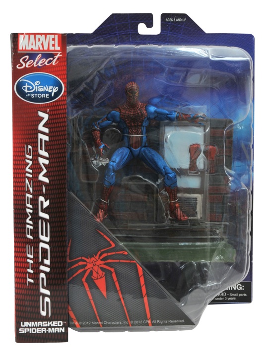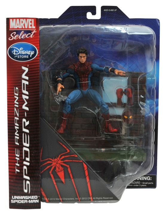 The first exclusive Marvel Select figure will be a version of Spider-Man with interchangeable gloveless hands, plus an interchangeable unmasked Peter Parker head, featuring the likeness of Andrew Garfield. The other exclusive figure will be an entirely metallic version of the regular Spidey figure, depicting the extra-shiny side of the new, big-screen Spidey-suit. Look for both special editions to arrive on MarvelStore.com, DisneyStore.com and Disney Store shelves in early July.