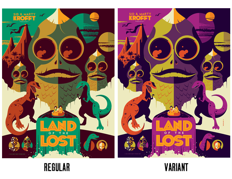 We have a very limited number of cool sleestak skull shirts ($20), embroidered hats ($25) and buttons ($2) that will be for sale. Artists Tom Whalen and Dave Perillo have created some amazing limited edition hand-pulled silk screen poster prints. Tom Wahlen’s Land of the Lost 6 color print will come in a numbered edition of 125pcs and sell for $60. The 6 color variant version will be a numbered edition of 75 pcs and sell for $85. Dave Perillo’s H.R.Pufnstuf 7 color print will come in a numbered edition of 125pcs and sell for $50. The 6 color variant version will be a numbered edition of 75 pcs and sell for $75.