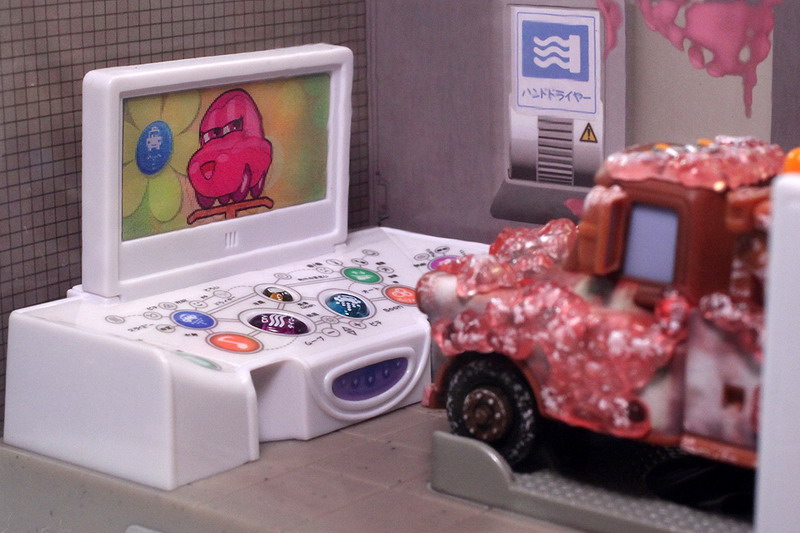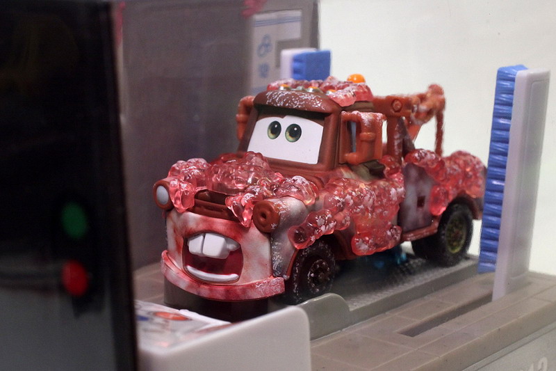 To activate the sights and sounds, press the button on the side and you’ll see the car wash scrub Mater’s sides, and a light up water fountain pushes Mater up. Once this happens you’ll hear Mater cry out in terror as the Japanese style music and dialogue plays. The control panel buttons flikr on and off. Pushing the button on the base for a 2nd time allows you to hear Mater’s gargling sounds. Push it a third time and Mater screams and then says “Hey, that tickles!” as the catchy tune comes to an end. Check it out in the video below.