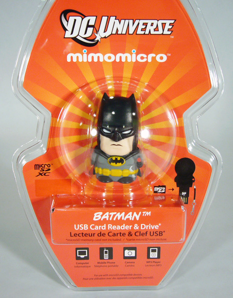 MIMOBOTS surround high quality USB drives with a firm plastic shell in the general shape of a tall-headed humanoid. At about 2.5 inches tall and 1 inch wide, they’re the perfect size for travel and use, while at the same time being fun collectibles. The beauty of the Mimobot is its simplicity, and the “sculpt” is limited to the general soft body shape, stumpy arms, and optional head decorations (some even have hairpieces that fit over the main body). Pop off the top of a Mimobot’s head to reveal the USB port (utilizing high speed USB 2.0 and fully Mac/PC compatible), and secure it again with a solid snap. The Superman Mimobot is available in your choice of capacities: 4GB, 8GB, 16GB, 32GB, and 64GB. Mimoco even goes a step further by offering exclusive pre-loaded “Mimory” including fun wallpapers, icons, and more. For those of you who take a lot of pictures and use different media you’re probably used to messing around with SD cards and clunky readers. Well, Mimoco makes transferring those files easy and fun with their new Mimomicros! 1 ¾ inch figures like Batman accept microSD cards (including SDHC and SDXC) and have flip-out USB 2.0 ports that’ll work in any computer.