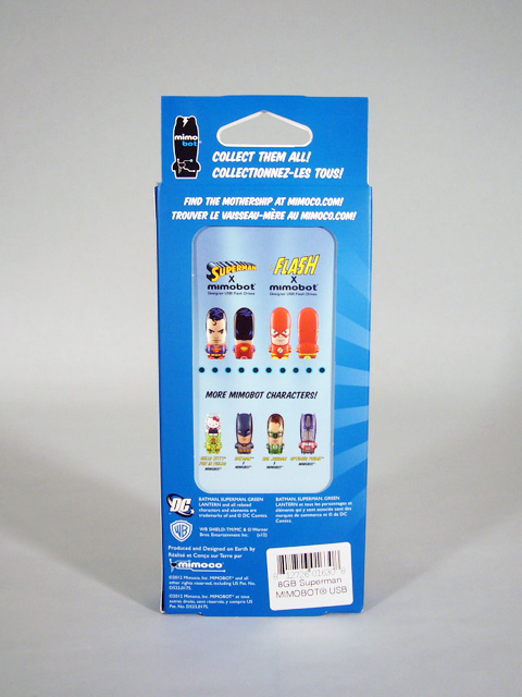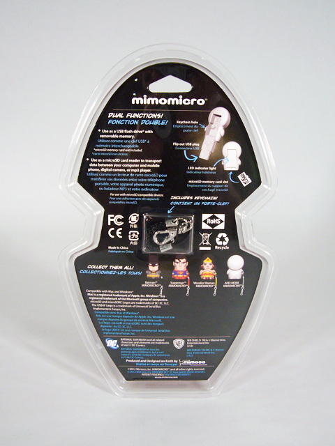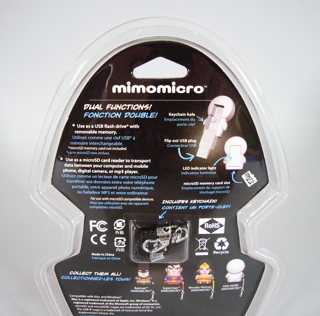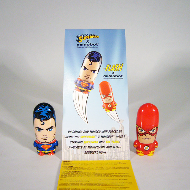 All DC Mimobots come packaged in the same style box, tall and narrow with an open window to see the drive. Superman’s DC Universe box is bright blue with white lettering. The series logo appears at the top, while next to the Mimobot cut out is a starburst pattern that draws in the eye. All of the pertinent info is down at the bottom, while a sticker at the right tells you the storage capacity. The back of the box shows off some other Mimobots on the market with a note at the top to “Collect Them All!” The insert behind Superman has a collage of pages from Clark Kent’s Daily Planet newspaper, and if you unfold it you’ll find a fun image of him with the Flash! Mimomicros, on the other hand, come packaged in a slick figure-eight clamshell that displays the reader in a little bubble at the center. The paper insert is a bright red with white lettering and another Mimoco sunburst behind the figure. The backside explains how the innovative little device works (with diagrams) and shows off the other Mimomicros. You can also see the reader’s keychain for easy transportation.
