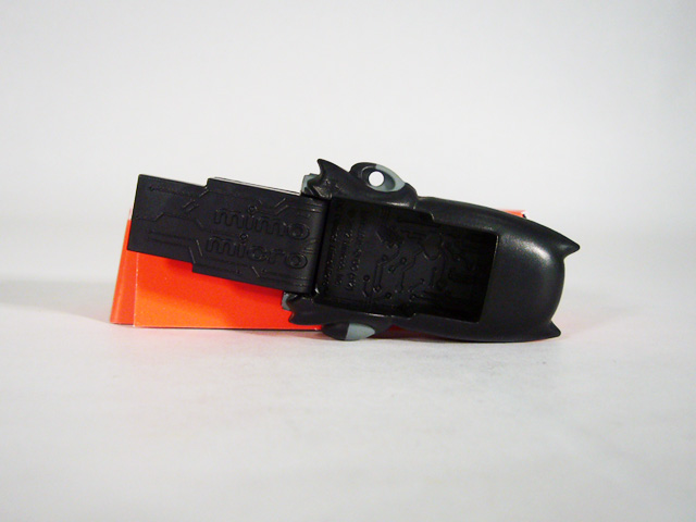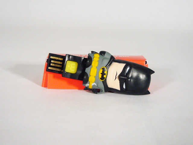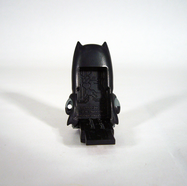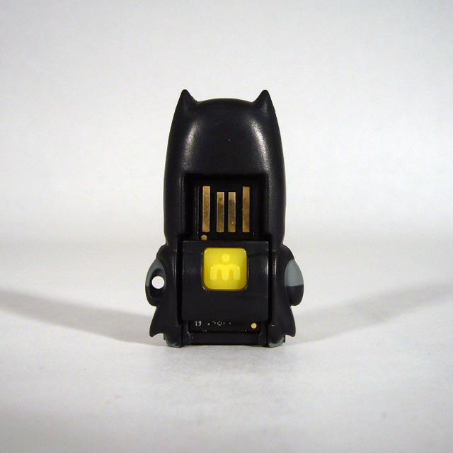 Like all Mimomicros, Batman has a hole through his left arm for you to string through the included keychain and carry him with you. Turn the Dark Knight around to see the flip-out USB reader emblazoned with a Mimoco “M” that lights up when it’s in use. And when you do reveal the reader you’ll also some fun added details: “mimo micro” on the reverse and the Mimoco circuit logo with heart inside of Batman.