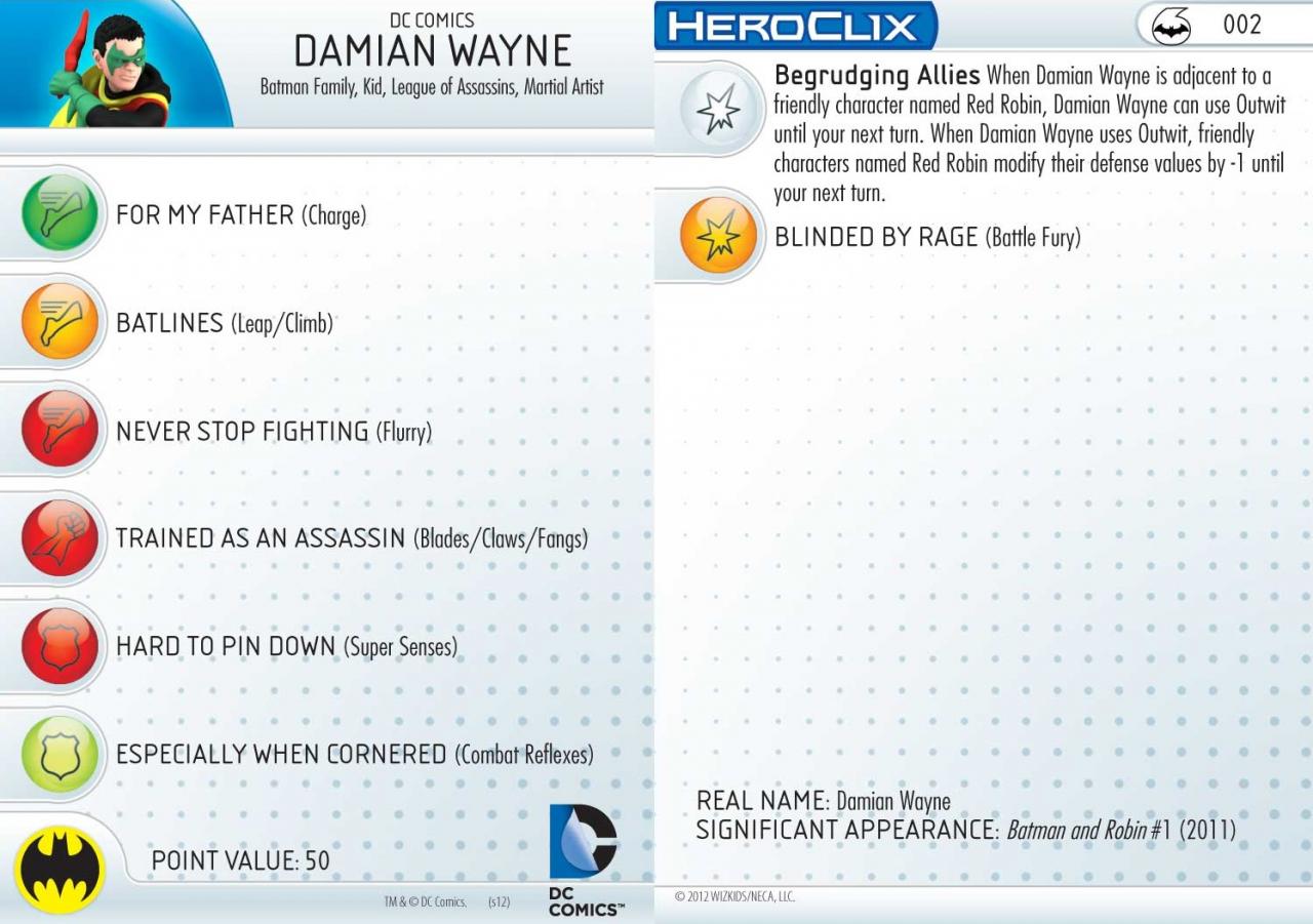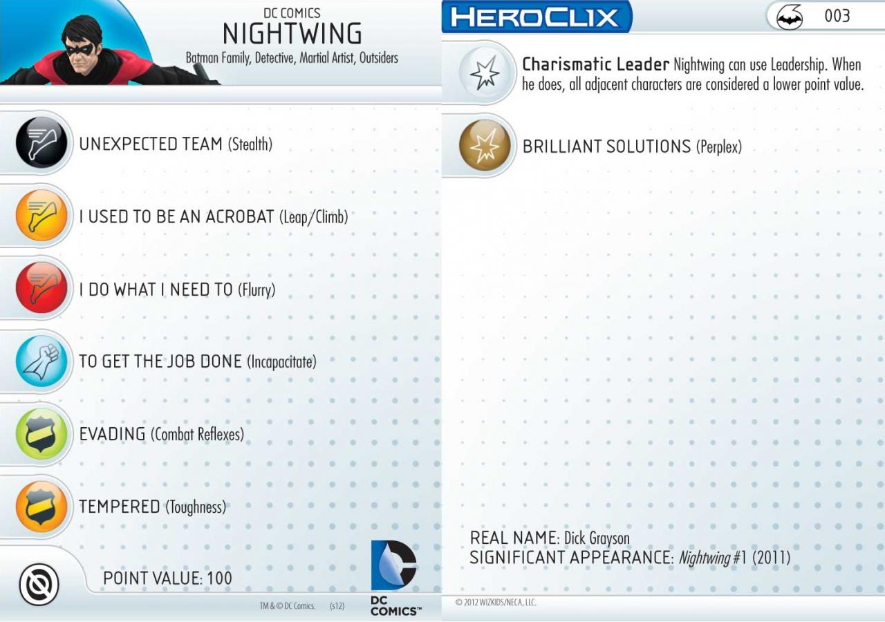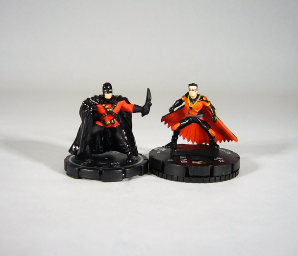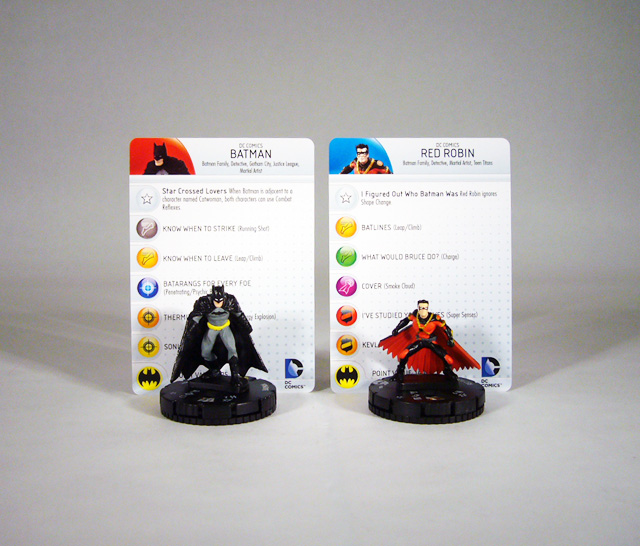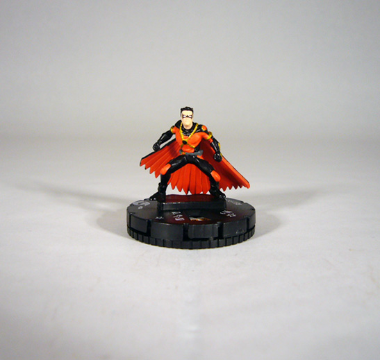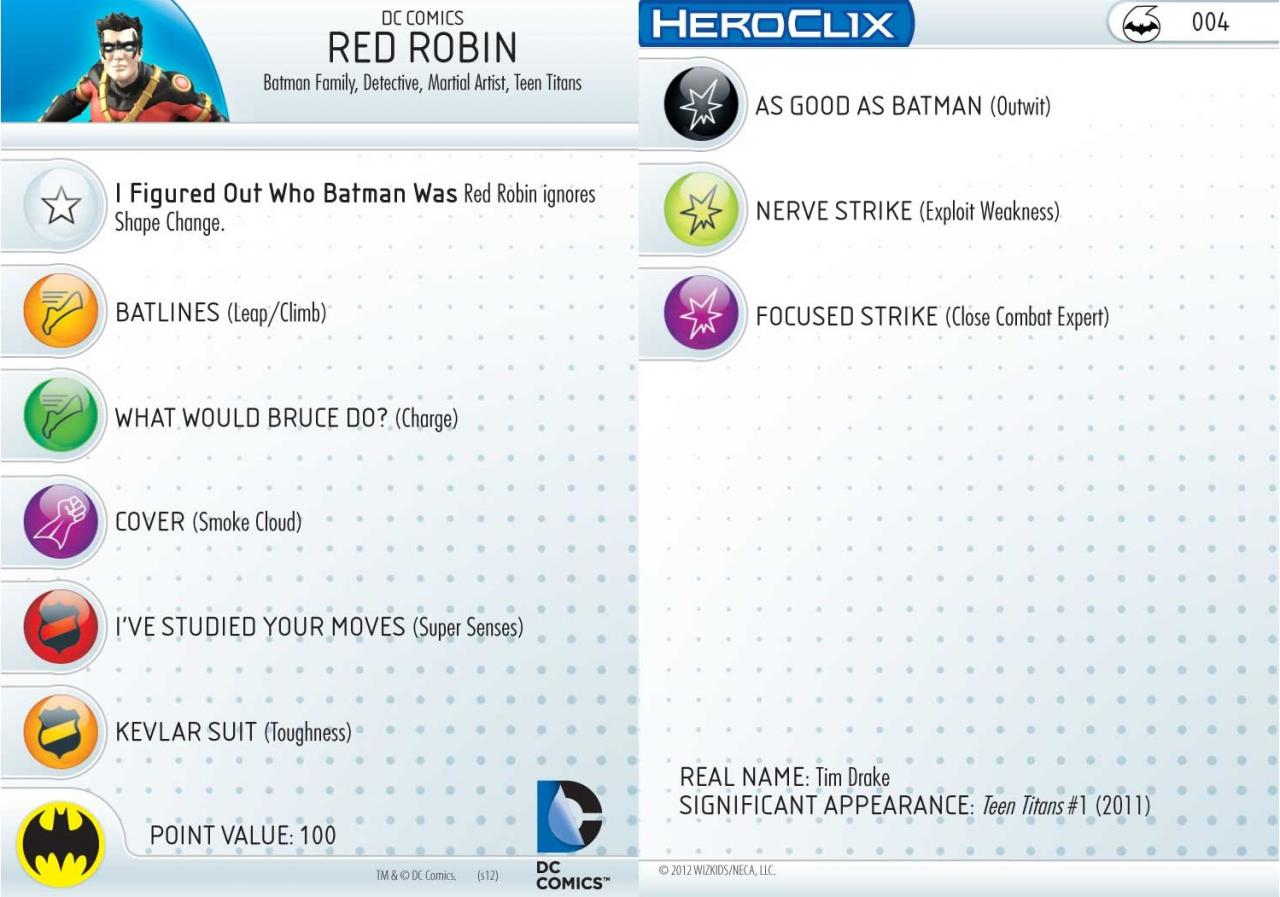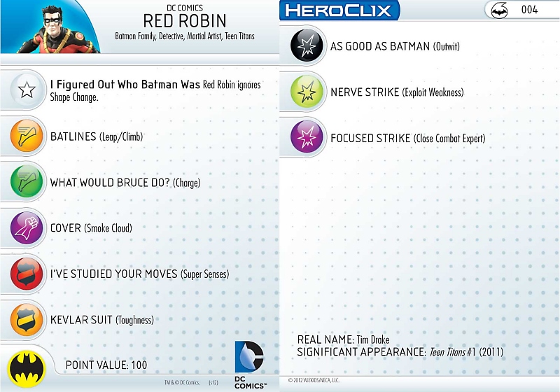 Damian Wayne is all close-combat oriented, getting into battle with Charge and then Leap/Climb, then dishing out damage with Blades/Claws/Fangs. He’s protected by Super Senses and Combat Reflexes, and he starts out with a special power that gives him Outwit when adjacent to Red Robin (though Tim has to pay the price). Drake and Grayson are both Indomitable with 6 range and two targets, but feature different team abilities and power sets. Red Robin is a Batman ally with a powerful trait ignoring Shape Change and a slew of powers like Leap/Climb, Charge, Smoke Cloud, Super Senses, Toughness, Outwit, Exploit Weakness, and Close Combat Expert. Nightwing on the other hand is an Outsider starting with Stealth, Combat Reflexes, and an amazing special power called “Charismatic Leader” that lets him use Leadership and remove a token from an adjacent ally no matter its point cost! Dick later cycles through Leap/Climb and Toughness then Flurry and Incapacitate with a long run of Perplex.
