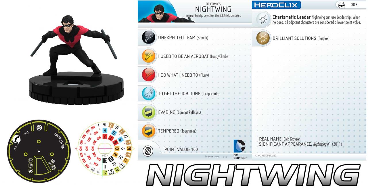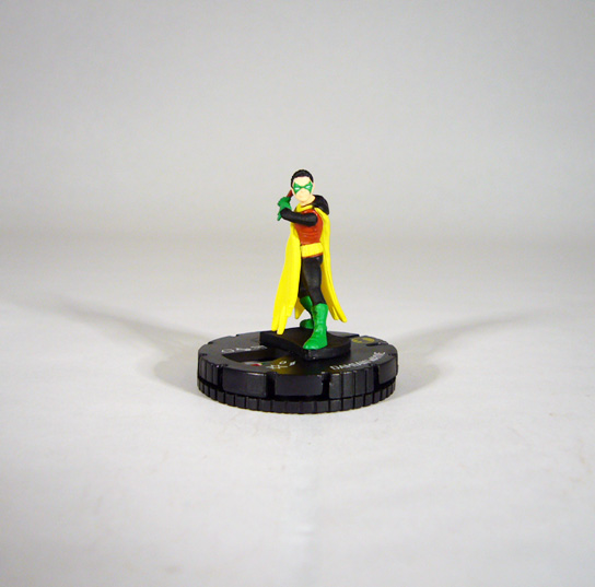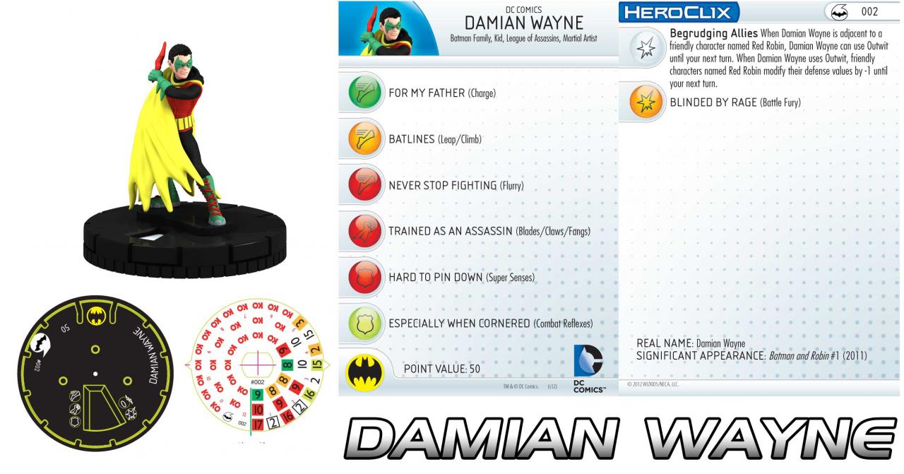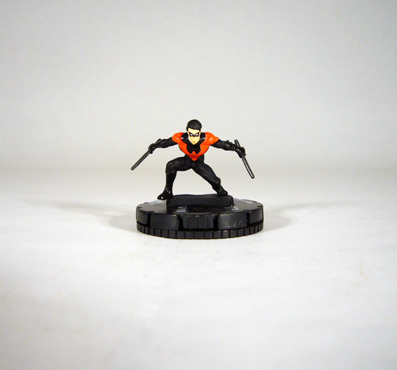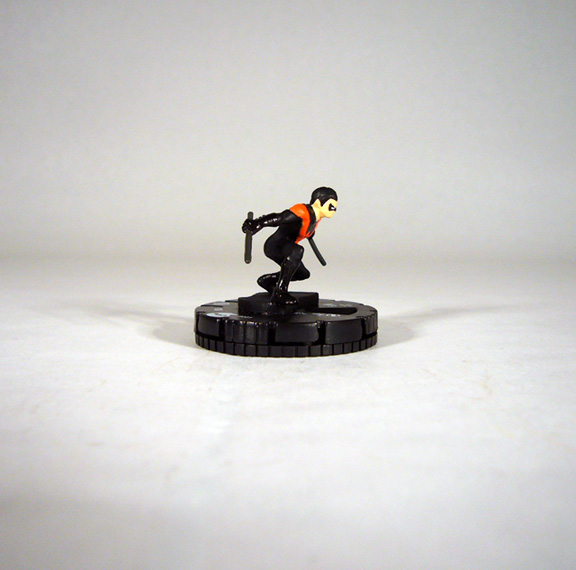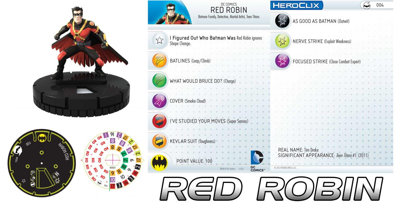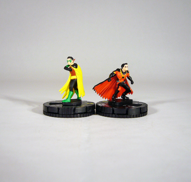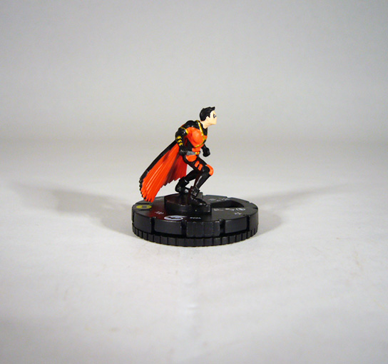 Damian Wayne is all close-combat oriented, getting into battle with Charge and then Leap/Climb, then dishing out damage with Blades/Claws/Fangs. He’s protected by Super Senses and Combat Reflexes, and he starts out with a special power that gives him Outwit when adjacent to Red Robin (though Tim has to pay the price). Drake and Grayson are both Indomitable with 6 range and two targets, but feature different team abilities and power sets. Red Robin is a Batman ally with a powerful trait ignoring Shape Change and a slew of powers like Leap/Climb, Charge, Smoke Cloud, Super Senses, Toughness, Outwit, Exploit Weakness, and Close Combat Expert. Nightwing on the other hand is an Outsider starting with Stealth, Combat Reflexes, and an amazing special power called “Charismatic Leader” that lets him use Leadership and remove a token from an adjacent ally no matter its point cost! Dick later cycles through Leap/Climb and Toughness then Flurry and Incapacitate with a long run of Perplex.