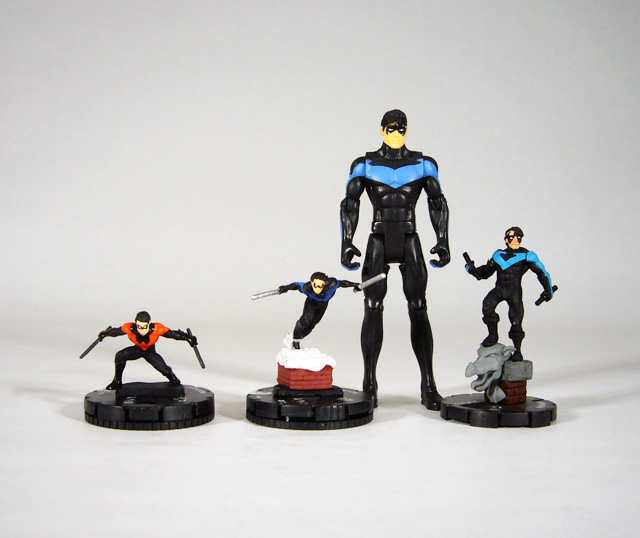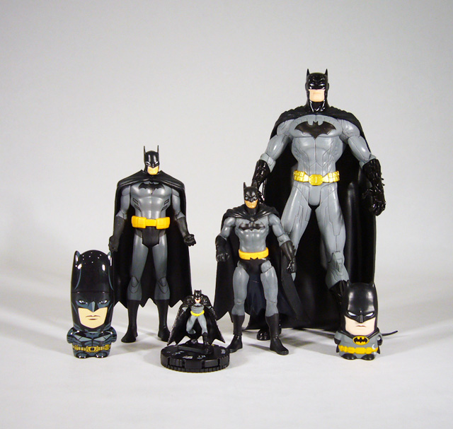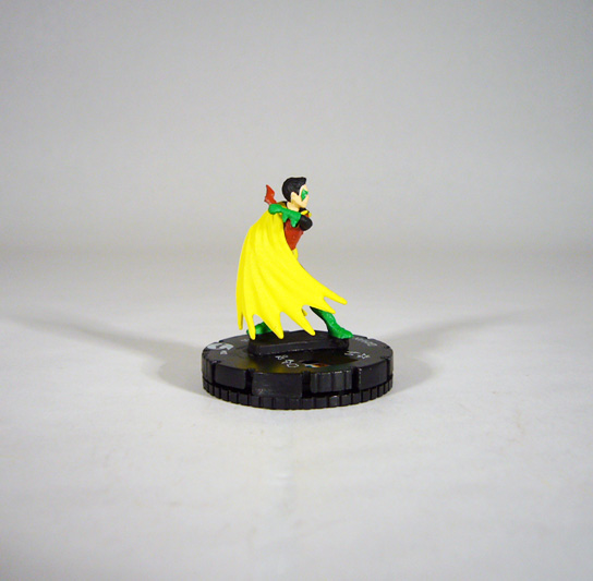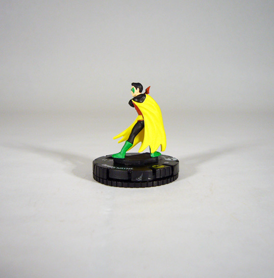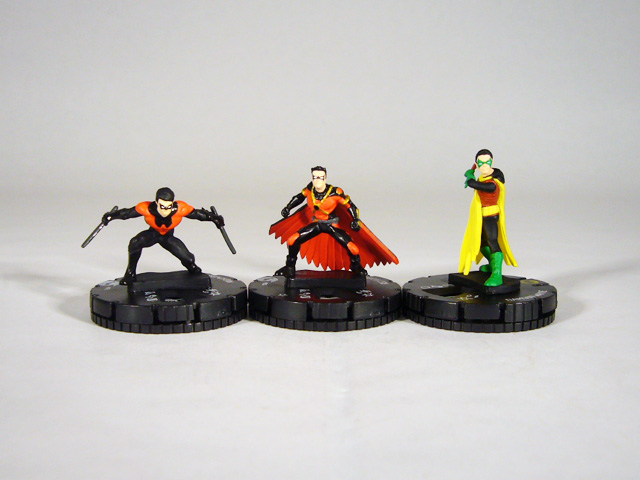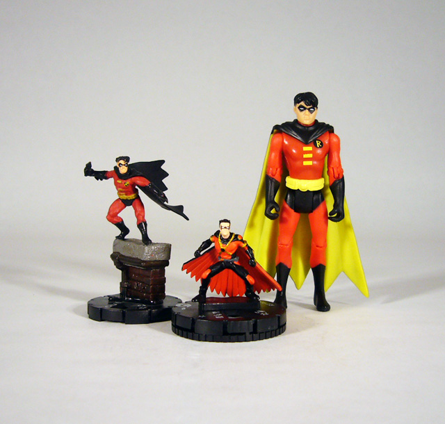 While secretive and mysterious, Batman and his allies are always ready for a fight. In fact, Bruce and his two former partners all feature variations on the same basic pose: leaning forward with one leg leading and arms out to the sides. Batman skulks forward, fists clenched and cape hanging closely around him. The acrobatic Nightwing has an energetic feel moving in a crouch with his arms flung wide, Eskrima sticks held outward. Red Robin adds a twist to the familiar pose, dropping back his right shoulder and fanning out his segmented cape. Young Damian Wayne takes a different tack, leaning out of his flowing cape to throw (or hit someone with) a batarang.