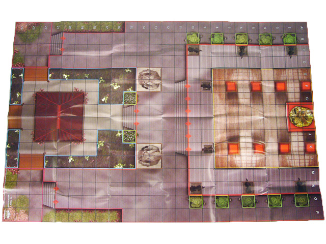 On the other side is “The Temple,” a serene locale with statues, trees, running water, multiple elevations, and a large interior meditation room. This map is notable for its starting areas: the two adjacent corners opposite the indoor section only eight squares apart!