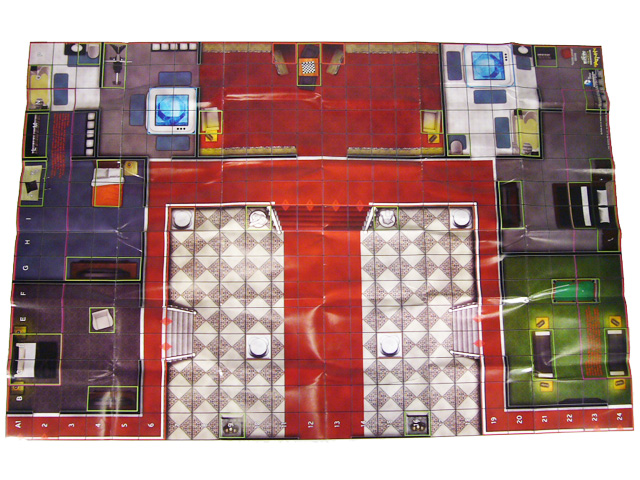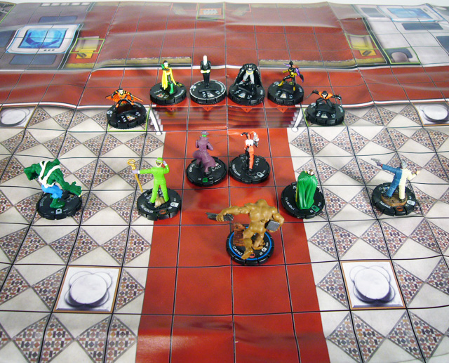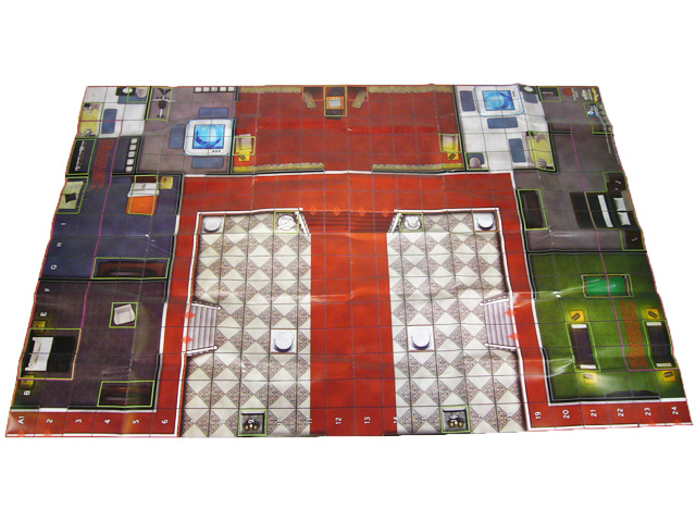 If the figures weren’t enough to interest you in this pack, then check out the maps. The main attraction here is “Wayne Manor,” the grand entranceway into Bruce’s home. Players start on either side of the entrance, sequestered in asymmetrical rooms on the second floor. The swanky pad has everything from columns (Blocking) and statues (Hindering) in the foyer to three sets of stairs, all sorts of furniture and entertainment in the rooms, hot tubs, exercise equipment, and more. There are even two special “Bat-pole squares” (secret passageways behind bookcases, of course) that let characters “slide” onto the Batcave map if you’re playing the two of them together!