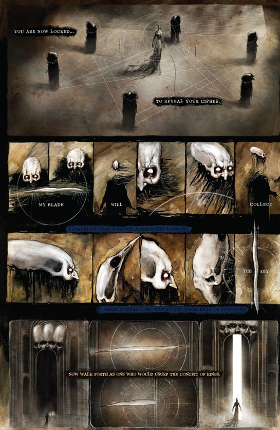 Upon first reading the story, Monocyte can seem confusing, rotund and even a bit convoluted at times. Monocyte includes everything from transhumanism, Judo-Christian history and alchemy to pagan ritual and mythology, Biblical scripture and Shakespeare. There are challenging ideas on every page and the language Ghanbari uses isn't your average graphic novel's 6th grade reading level. However, upon repeat readings, the story's purpose becomes clearer. As readers, we have been challenged and the creators expect us to question and grow. For some, this may be too much; but for those willing, Monocyte's story design and progression makes for an engaging tale that's unusual, unique and altogether worth the experience. Add to this the musical CD Monocyte, a combination of trip-hop electronics meets violin and cellos by menton3 (as Saltillo) and you've got yourself a wholly unseen, unheard creation that's both perplexing and mesmerizing to the average comic fan.
