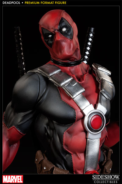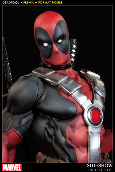 After numerous teasers, Sideshow today fully unveils their Deadpool Premium Format Figure... and has opened pre-orders. Priced at $349.99 (with payment plan available) and shipping in June 2013, fans will want to get their orders in now for the Sideshow Exclusive Deadpool PFF which includes a switch-out hand holding a rubber chicken... stuffed with dynamite! Standing at 20 inches in overall height on a base ringed with bullets, the Deadpool PFF (regular and exclusive) also features two interchangeable heads for alternate display.