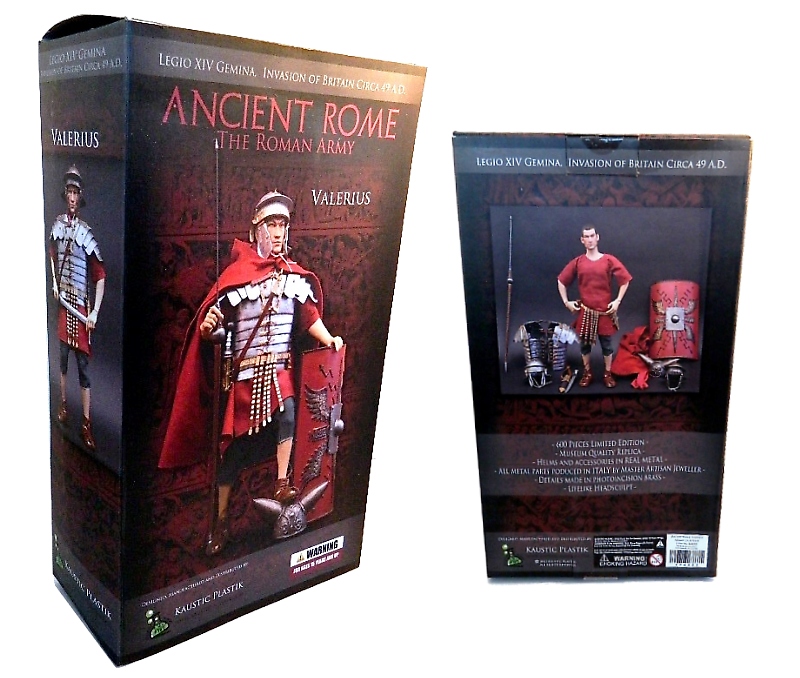 Kaustic Plastik starts down that road of authenticity with Valerius' packaging. A fifth window box affair, the pack comes adorned with photos of the figure on all sides. The back provides some details, including Valerius' edition size (only 600 pieces worldwide - no wonder he quickly sold out!) and the use of real metal on his helmets and accessories. Flipping open the fifth panel is where our history lesson begins; Kaustic providing a fascinating account of Valerius, his XIV Legion and their invasion of Britain, circa 49 AD. While the figure is named Valerius, a very common name for the time, this doesn't appear to be a figure of any one particular soldier, but rather a faithful representation of one during that time period.