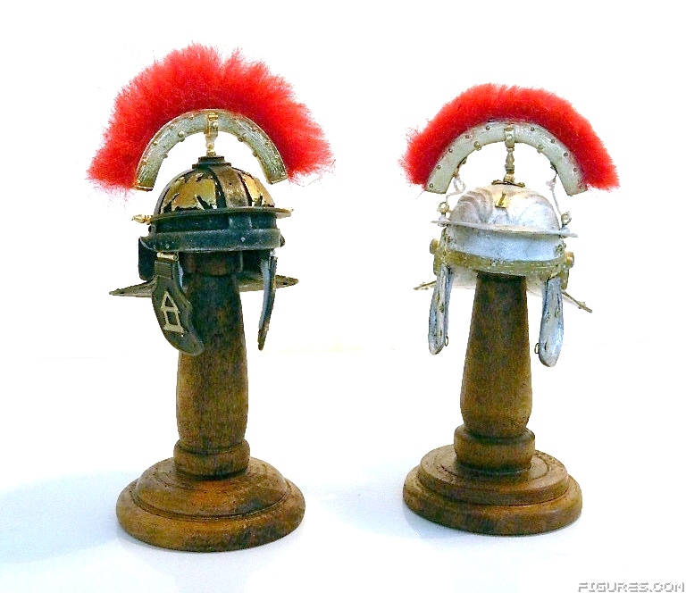 For those looking to promote Valerius to the rank of Roman Centurion, Kaustic Plastick has also released two additional helmets as part of their Museum Collection: a dark bronze Italic Imperial Centurion Helm and a regal silver and gold Imperial Gallic Centurion Helm. Sold separately at $40 each, these helmets are similar in design to those included with the figure except that they feature more ornate detailing and most noticeable, a huge red plume. Each helmet also includes a wooden stand, a very nice touch that allows you to display these as collectibles all on their own - which they are - each helm is simply a work of art.