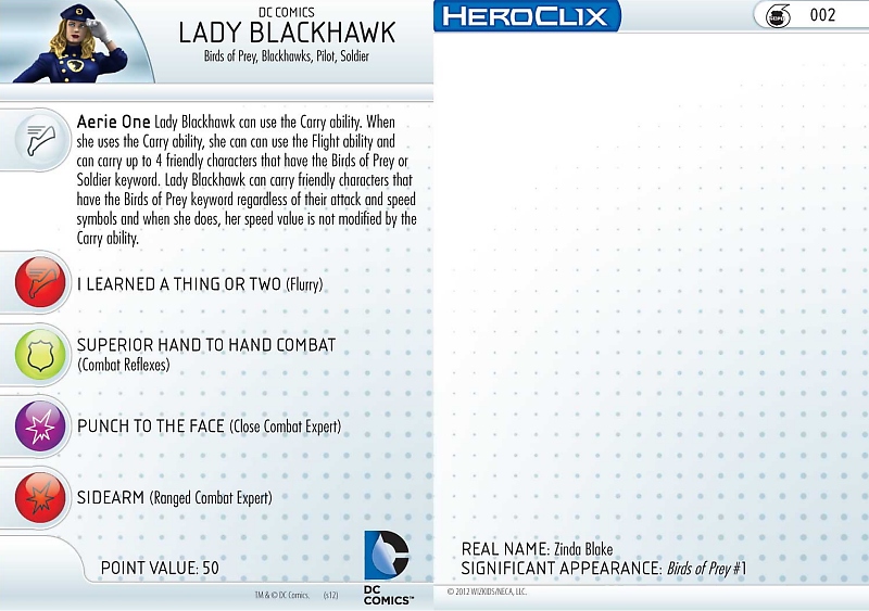 Like Canary, Huntress has the same “In Contact” trait, Batman Ally team ability, and no special powers. Hers transition from ranged to close combat starting with Running Shot and Willpower, then Leap/Climb, Penetrating/Psychic Blast, Toughness, and Ranged Combat Expert mid-dial, and finally Flurry, Blades/Claws/Fangs, and Combat Reflexes to keep her deadly at the end. With a 7 range and two targets Huntress is sure to deal a lot of damage. Focusing less on damage and more on support is Oracle, who begins the game with Stealth, Incapacitate, Shape Change, and a special power that lets her move teammates. She’ll keep that power for three more clicks along with Phasing/Teleport and alternating Perplex and Outwit. Another “team player” but with bite of her own is Lady Blackhawk. The ace pilot starts out with a 10 movement and “Aerie One” special power with a super-charged Carry ability that breaks all the usual rules! After airlifting in her teammates Zinda switches mid-dial to Flurry, Combat Reflexes, and Close Combat Expert to do her share of the fighting. End dial she hops in Aerie One again to evacuate any injured allies, and a click of Ranged Combat Expert lets her shoot back at those chasing her.