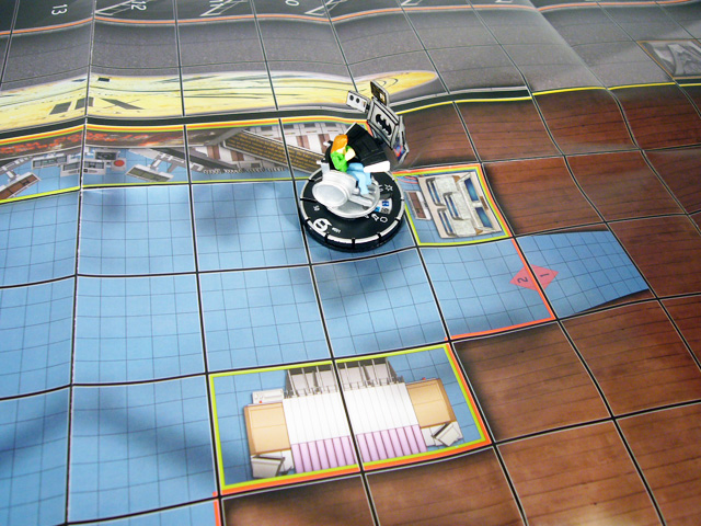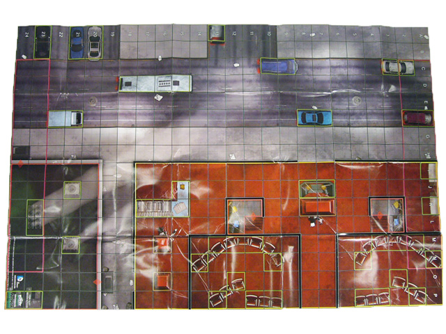 Beyond the great figures each Fast Forces pack comes with cool new maps, and the Birds of Prey here are no exception. On one side is Crime Alley, “birthplace” of Batman! It was here that Thomas and Martha Wayne were shot to death in an alley outside of a theater. In this new Indoor/Outdoor map, Crime Alley is a depressed area of Gotham City with a busy street on one side and the decrepit theater on the other. The outdoor portion is pretty much what you’d expect, with some varied terrain including a small secondary building (elevated), cars (hindering), and AC units (hindering). Meanwhile, the interior of the theater offers a maze of many terrain types with walls, blocking columns, elevated projection booths, and hindering ticket booth, concessions stand, and theater chairs. The starting areas on this map are on either short side, which means that while both players share the street one can start on top of the small building while the other can set up in the theater. There are several neat small details on this map that hardcore Bat-fans will enjoy like the commemorative roses placed in the alley for the Waynes and the torn remains of posters for what looks like a Zorro film in the lobby of the theater.