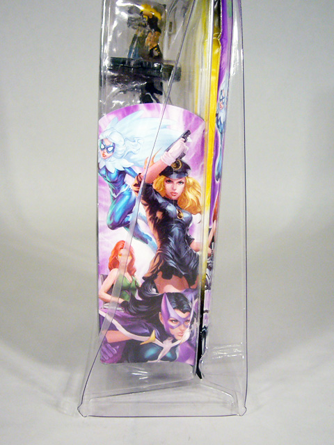 Lady Blackhawk, giving a saucy salute with her other hand on her hip, is dressed in a feminine version of the iconic Blackhawks uniform consisting of a buttoned up jacket, short skirt, boots, gloves, and military cap. Huntress stands straight as an arrow with her head turned and arm upraised to shoot her mini crossbow. Her unique purple, black, and white costume is very detailed with multiple belts and pouches, textured gloves and boots, tall pointed mask, and a cape floating behind her. Hawk and Dove are as different as their namesakes, Hank foreboding with his arms crossed as he tries to keep his anger in check and Dawn leaping into the fray to protect innocents. Their costumes reflect their differences as well, hers in pale blue and white with a fringed collar/cape and his in white and red with jagged edges and long tendrils over his shoulders.