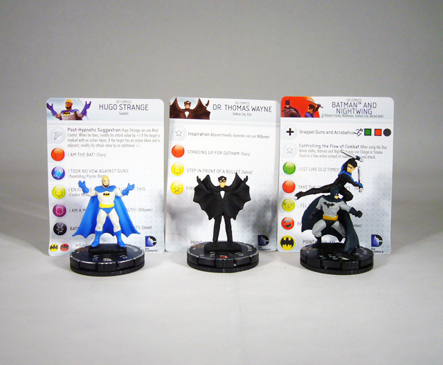 The HeroClix scene right now is in a full on Batman-frenzy, and it’s not stopping anytime soon. This week we’ve already given you in-depth looks at the upcoming No Man’s Land Month 2 (January) tournament prize kit and the Batman: Streets of Gotham Fast Forces pack due out next week. Along with that pack and a full set of single figure boosters AND team packs, “Streets” includes an exclusive prize kit only available to stores to be used for tournaments and giveaways. This Organized Play (OP) kit comes with multiple copies of three figures, two objects, and a new double-sided map, all of which are exclusive and can’t be purchased any other way. The three figures include four characters who have worn or are wearing a Batman suit: Hugo Strange, Dr. Thomas Wayne, and the duo of Batman and Nightwing!