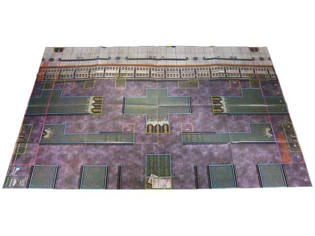 Killer Croc’s Sewer Lair indoor map! A convoluted battlefield with lots of walls to funnel the action and block lines of fire, the Lair tells a story with a subway line one side with a perforated wall separating it from the sewer system that Croc calls home. Waterways and drainage pipes provide lots of water and some hindering terrain, and the aforementioned Manhole squares work the same way as they did topside. There’s a really neat artistic element on this map; in the center of the long side opposite the subway is the centerpiece of Killer Croc’s lair: a blood and gore-stained pile of mattresses surrounded by bones!
