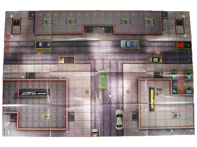Packed along with the figures and objects in this kit are 10 two-sided maps to make your games even more “at home” in Gotham City. The first one literally brings the set to life with the Streets of Gotham City outdoor map! Similar to urban environments we’ve seen in HeroClix before, “Streets” offers a nice mix of grounded, hindering, and elevated terrain (with only a few squares of blocking and no water). Starting areas are on the short sides, each one overlapping a small elevated building; a long narrow building runs down one of the long sides. On the ground level cars and umbrellas provided hindering squares for Batman Allies to use Stealth, while air conditioning units on the roofs do the same. One building has a “Space for Lease” billboard while the other features a sign for Luigi’s Pizzeria, “Gotham’s Finest Slice.” Finally, this map has six orange “Manhole” squares; if you’re playing with the map on the other side you can give a character on one of those squares a power action and place it on the corresponding square there, in...