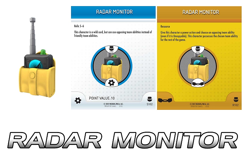 Like the Batarangs and others, the Radar Monitor can be played as a relic or attached to the Utility Belt resource dial. A repaint of the Sonic Transmitter (with a blue screen and green light), the Monitor functions as a 10 point relic that when picked up turns a character into a wild card who can only use his/her opponent’s team abilities. But wait till you put it on the Utility Belt... as a resource the Radar Monitor lets a character possess an opposing team ability, even if it is Uncopyable!