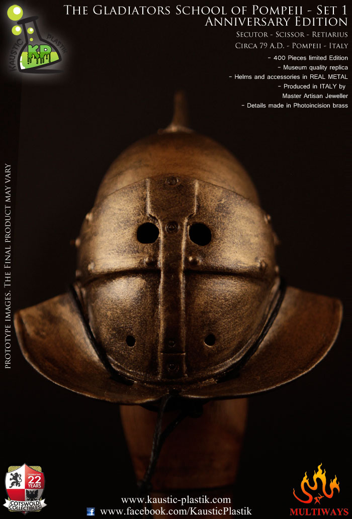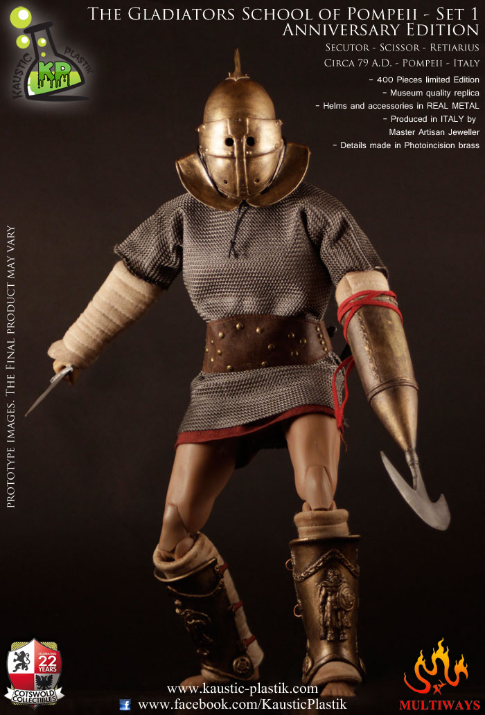 Strictly limited to only 400 pieces worldwide, this triple pack includes all the accessories needed to create 3 different warriors of the arena: Secutor, Scissor, and Retiarius.